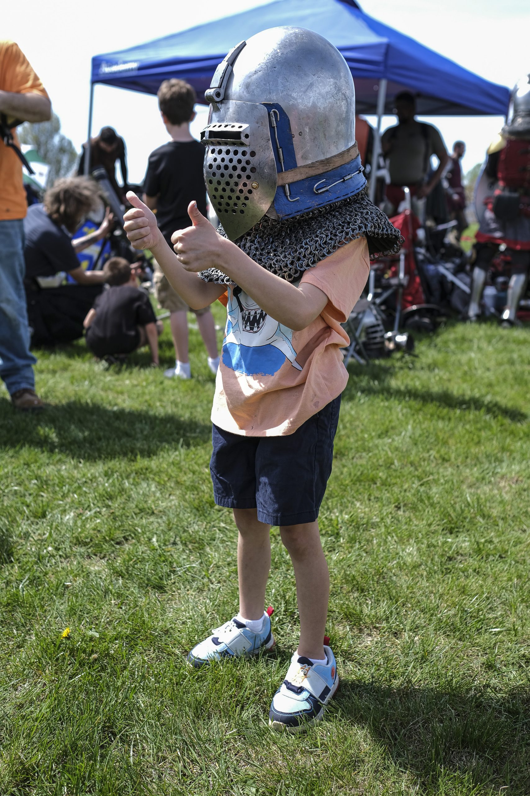 Benjamin Junior tries on a armor helmet in the armored combat area during the Eclipsing the Renaissance eclipse viewing event at the Columbus Airport Airpark in Columbus, Ind., Monday, April 8, 2024.