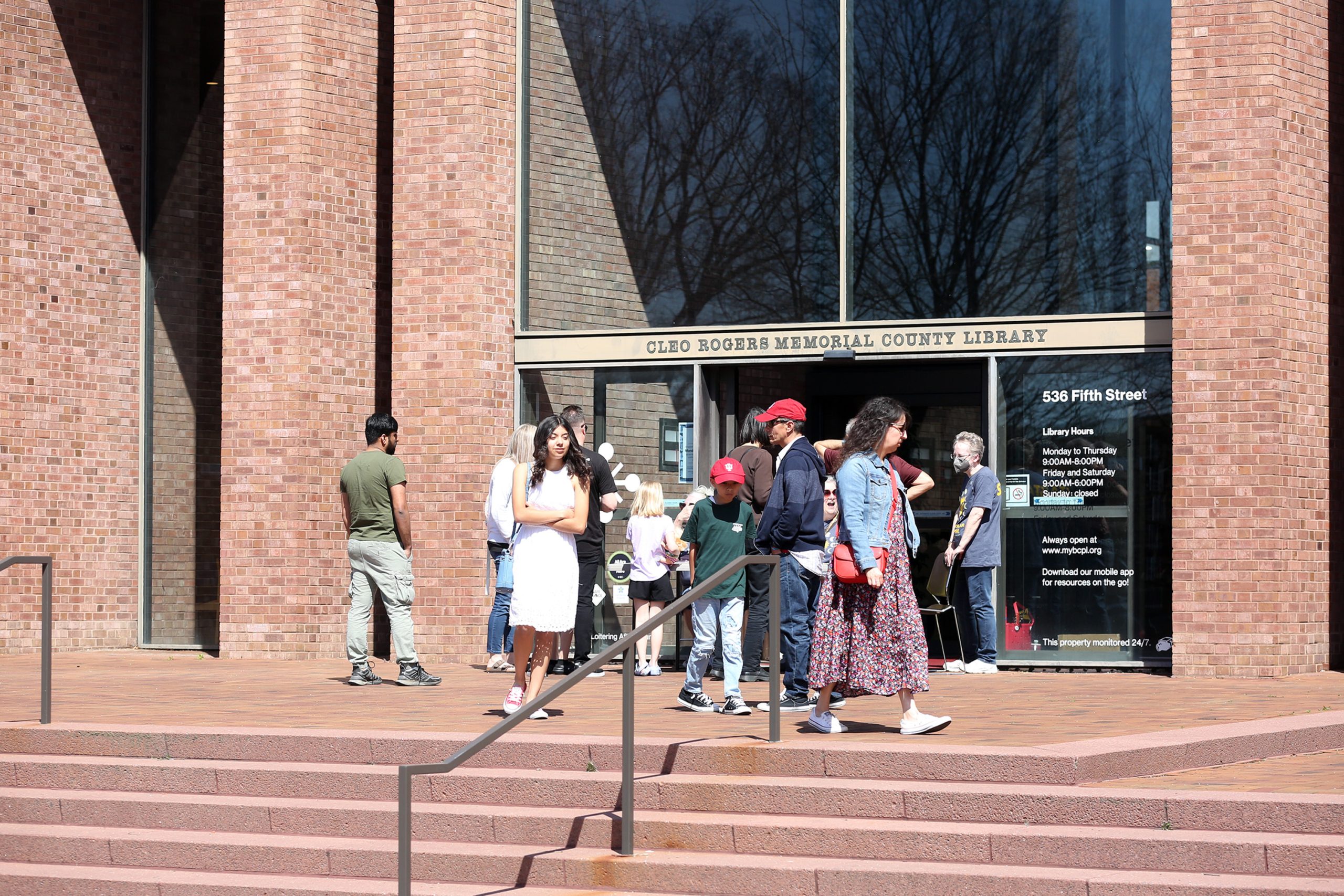 People line up to get free eclipse glasses and information at the Bartholomew County Public Library, Columbus, Ind., Monday, April 8, 2024.