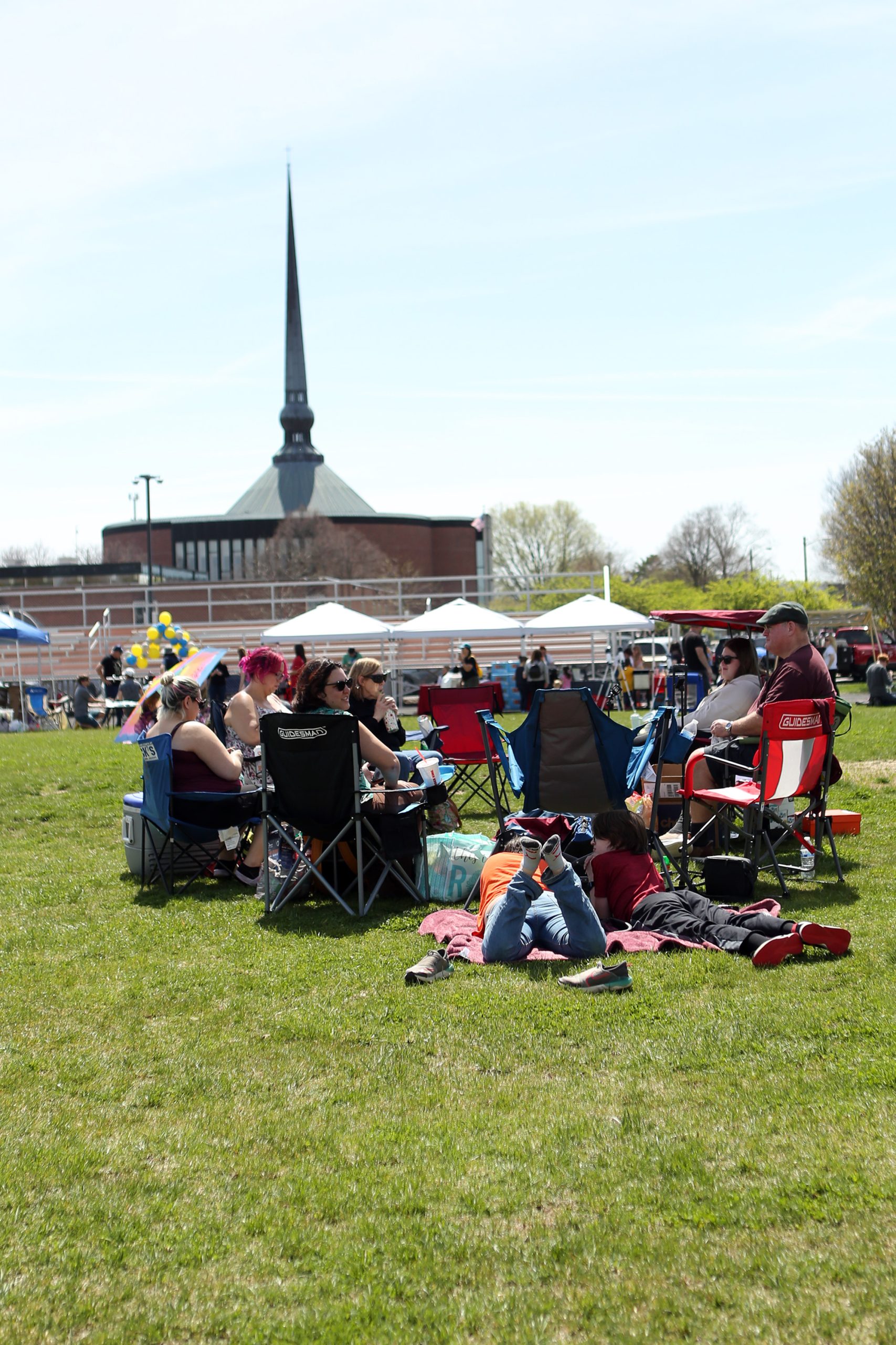 People visit and wait for the eclipse during the Solar Spectactular Eclipse Viewing Party hosted by kidscommons and the Bartholomew County Public Library at Central Middle School, Columbus, Ind., Monday April 8, 2024.