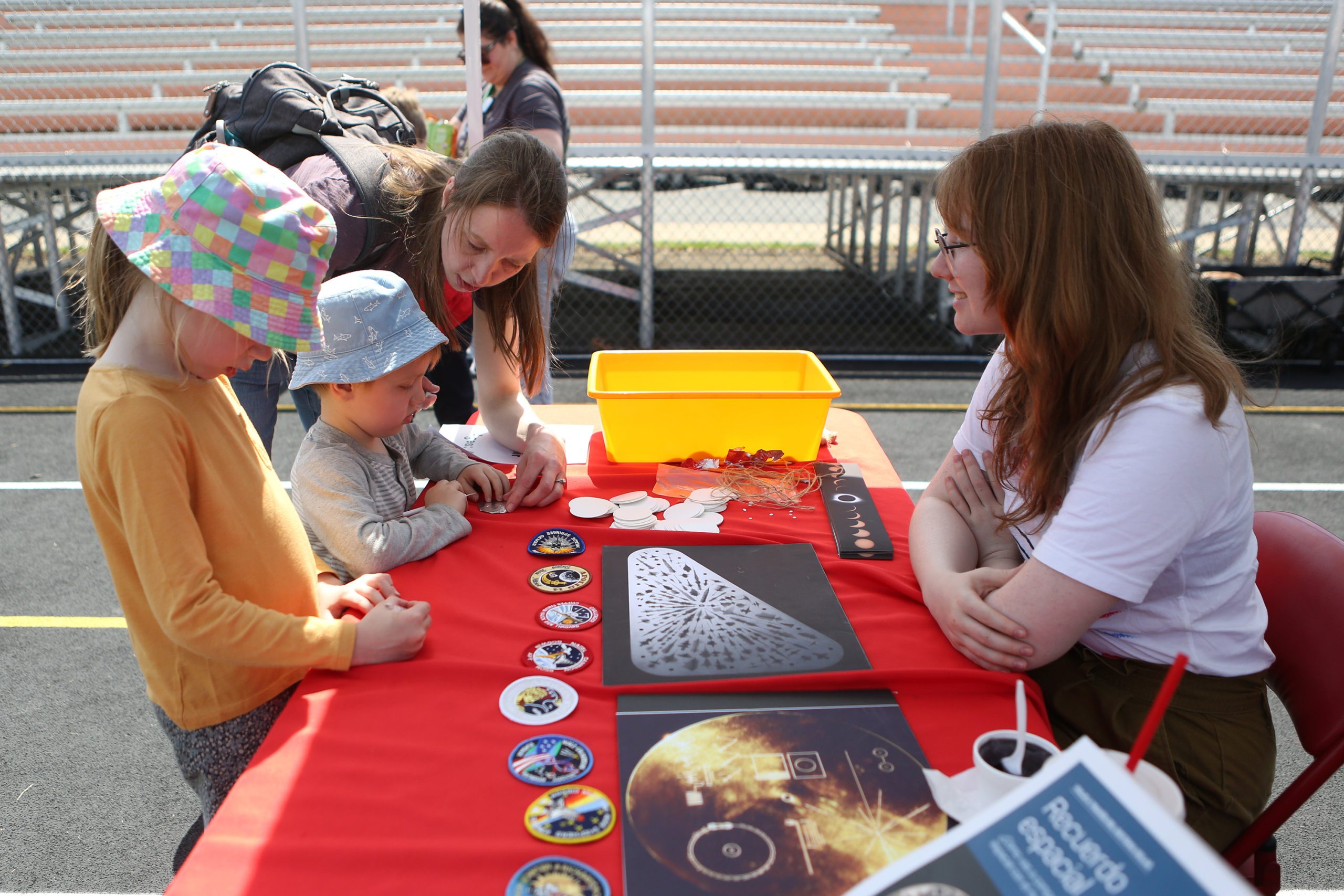 Samantha Herr, from front left, Ethan Herr, and Lisa Herr, from Chicago, make astronaut patches with the help of Emma Warnock from kidscommons during the Solar Spectactular Eclipse Viewing Party hosted by kidscommons and the Bartholomew County Public Library at Central Middle School, Columbus, Ind., Monday April 8, 2024.