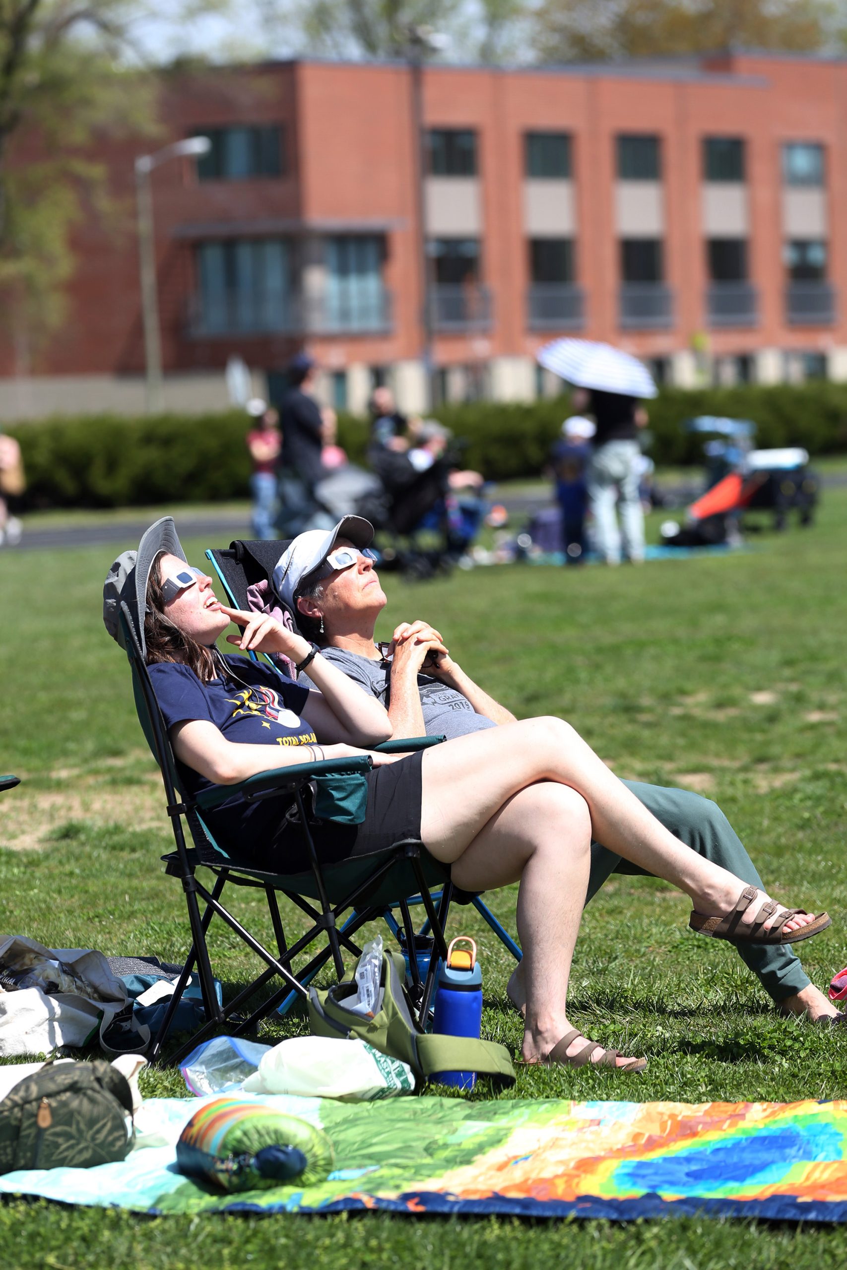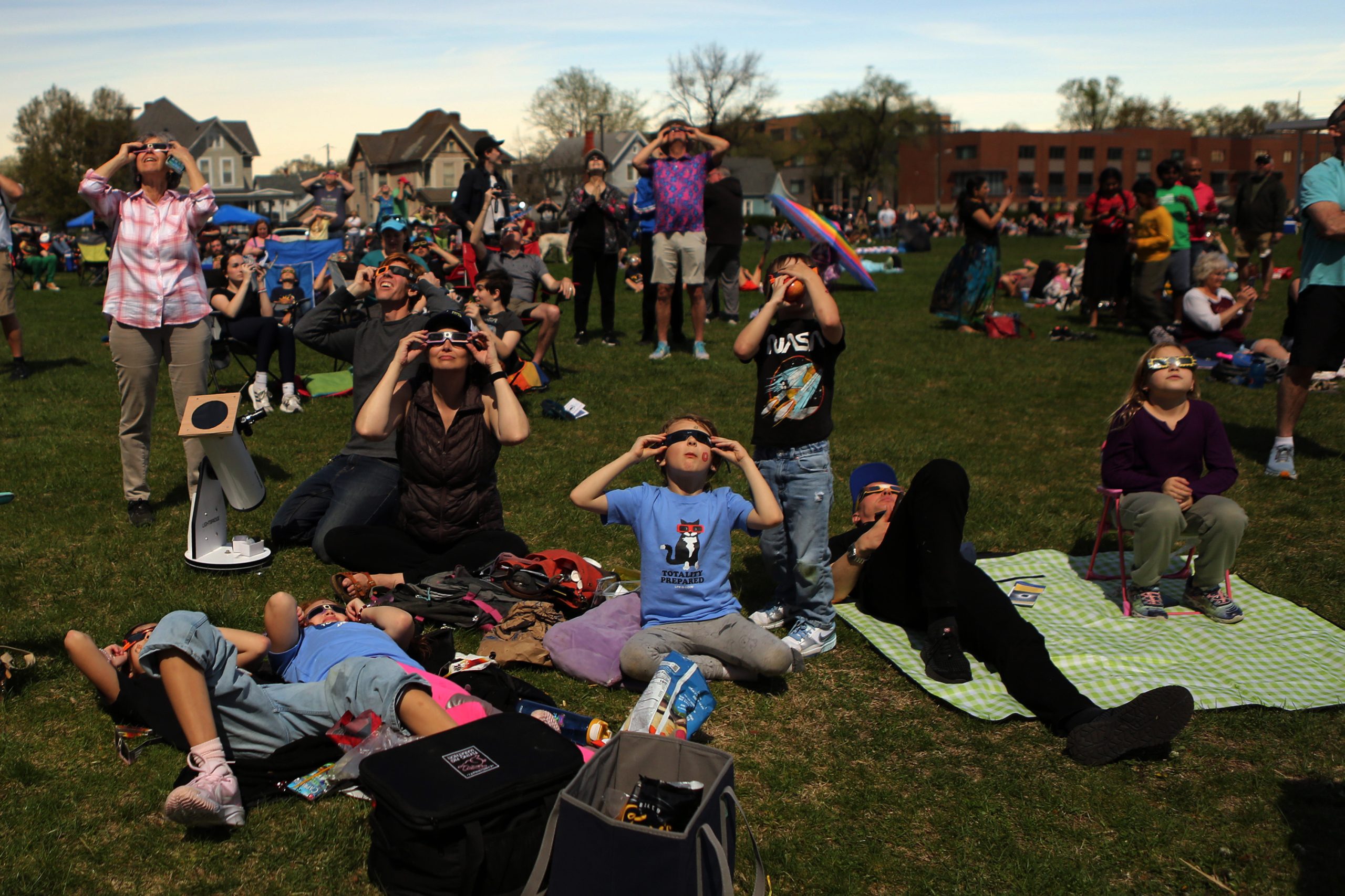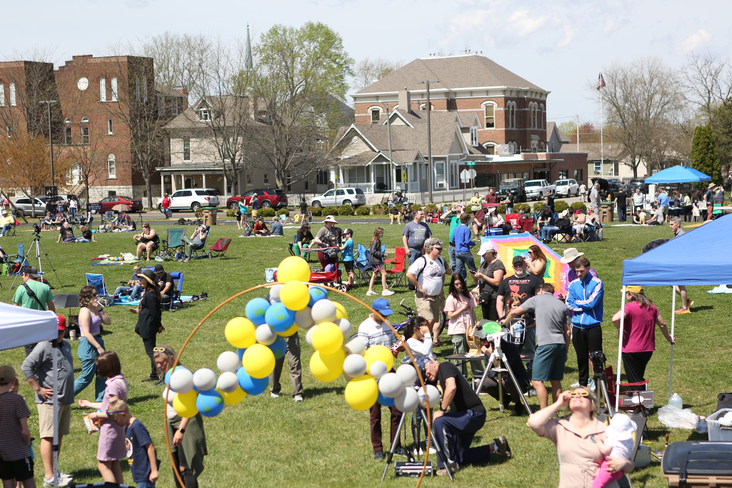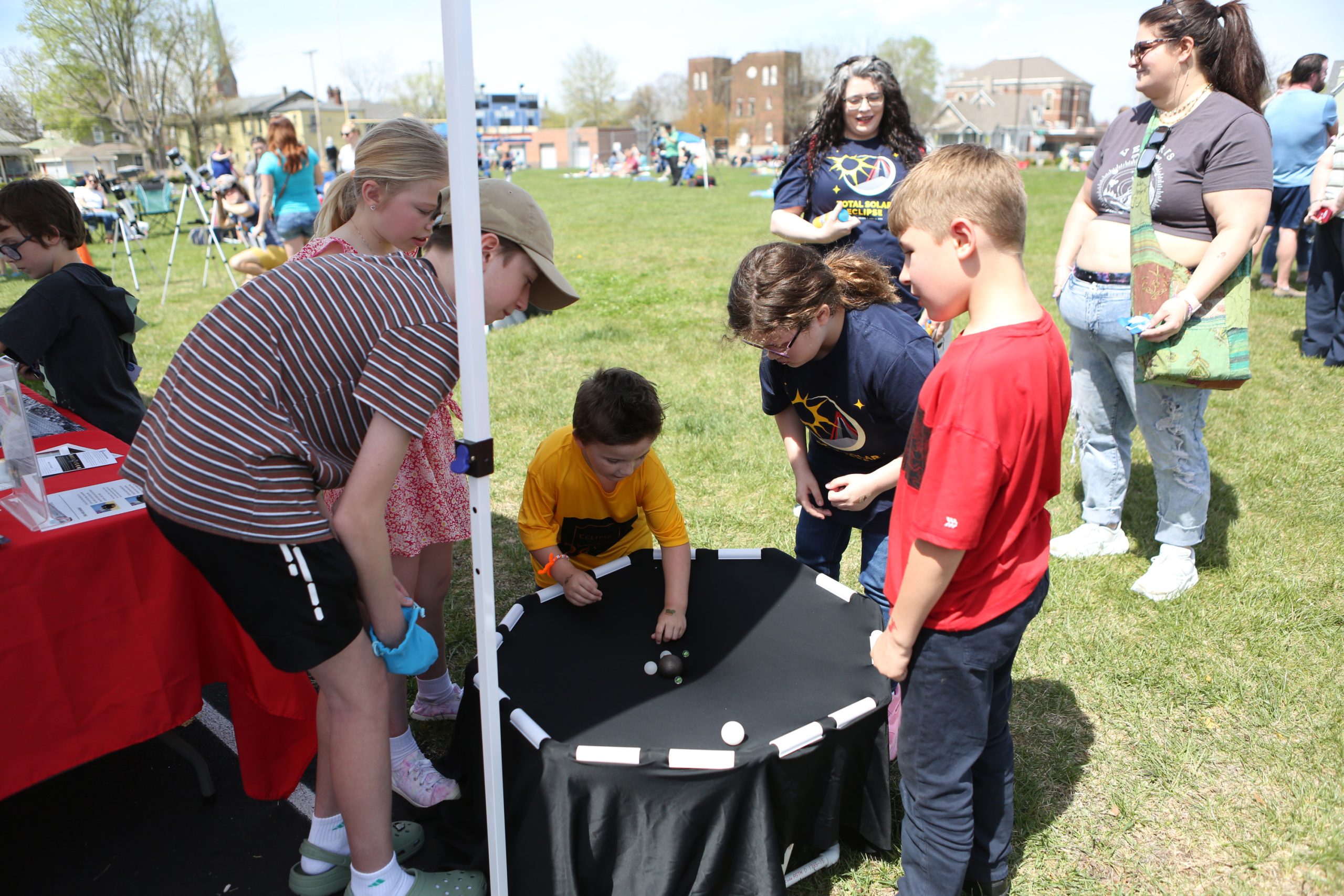 People visit, do activies and watch as they wait for the total eclipse during the Solar Spectactular Eclipse Viewing Party hosted by kidscommons and the Bartholomew County Public Library at Central Middle School, Columbus, Ind., Monday April 8, 2024.