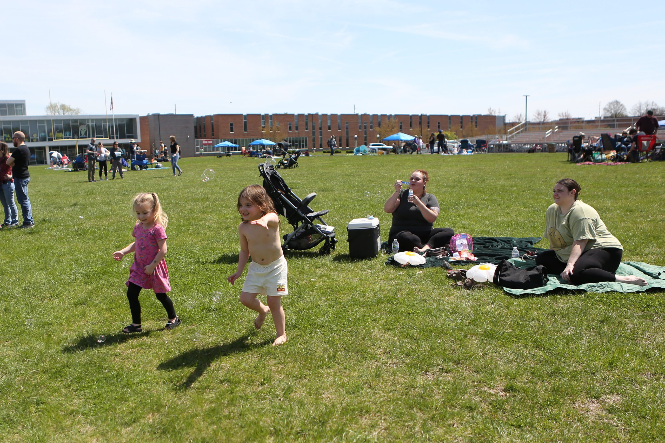 Charlotte Beckwith and Atlas Bailey chase bubble blown by Stevie Beckwith during the Solar Spectactular Eclipse Viewing Party hosted by kidscommons and the Bartholomew County Public Library at Central Middle School, Columbus, Ind., Monday April 8, 2024.