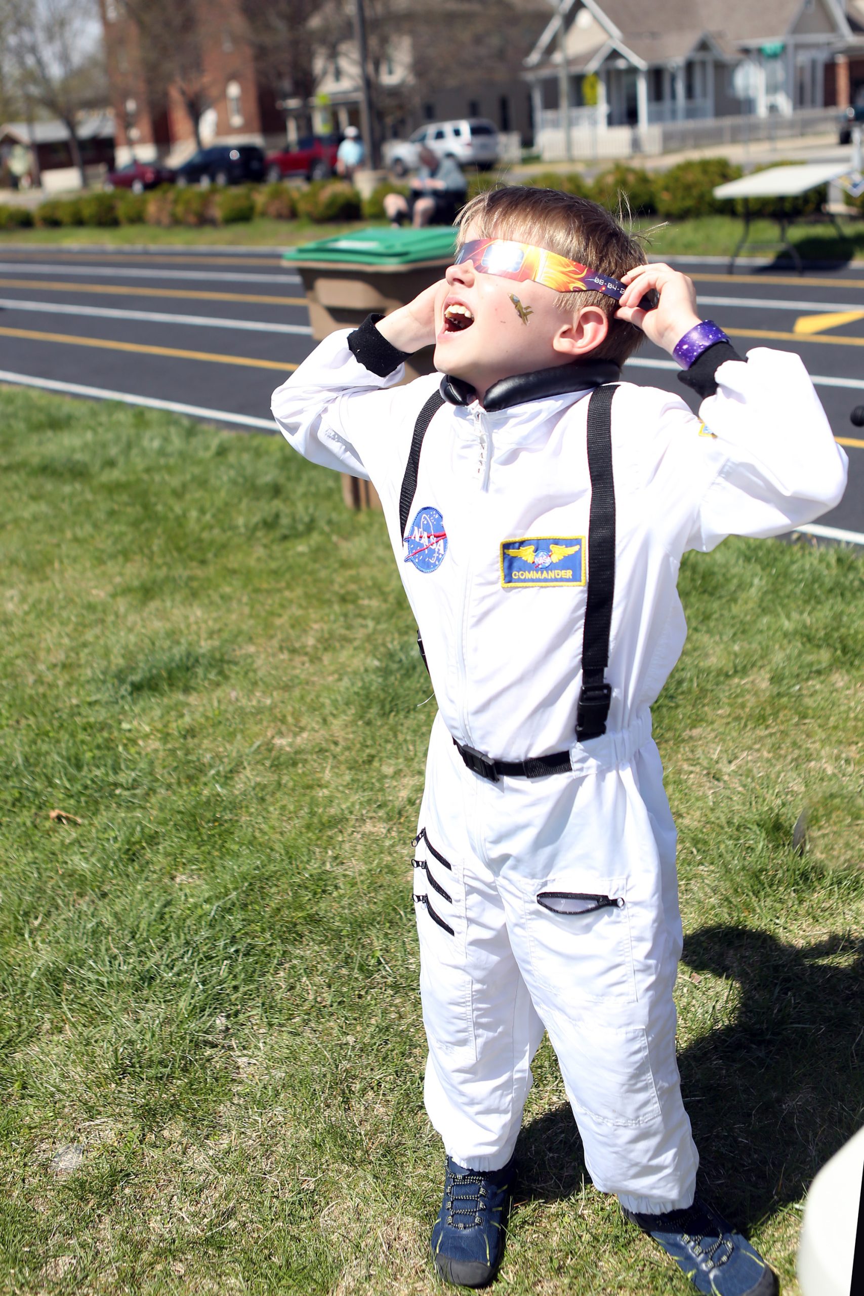 Asher Anderson from Oakridge TN, wearing his suit from the Smithsonian Air and Space Museum puts on his eclipse glasses as the eclipse begins during the Solar Spectactular Eclipse Viewing Party hosted by kidscommons and the Bartholomew County Public Library at Central Middle School, Columbus, Ind., Monday April 8, 2024.
