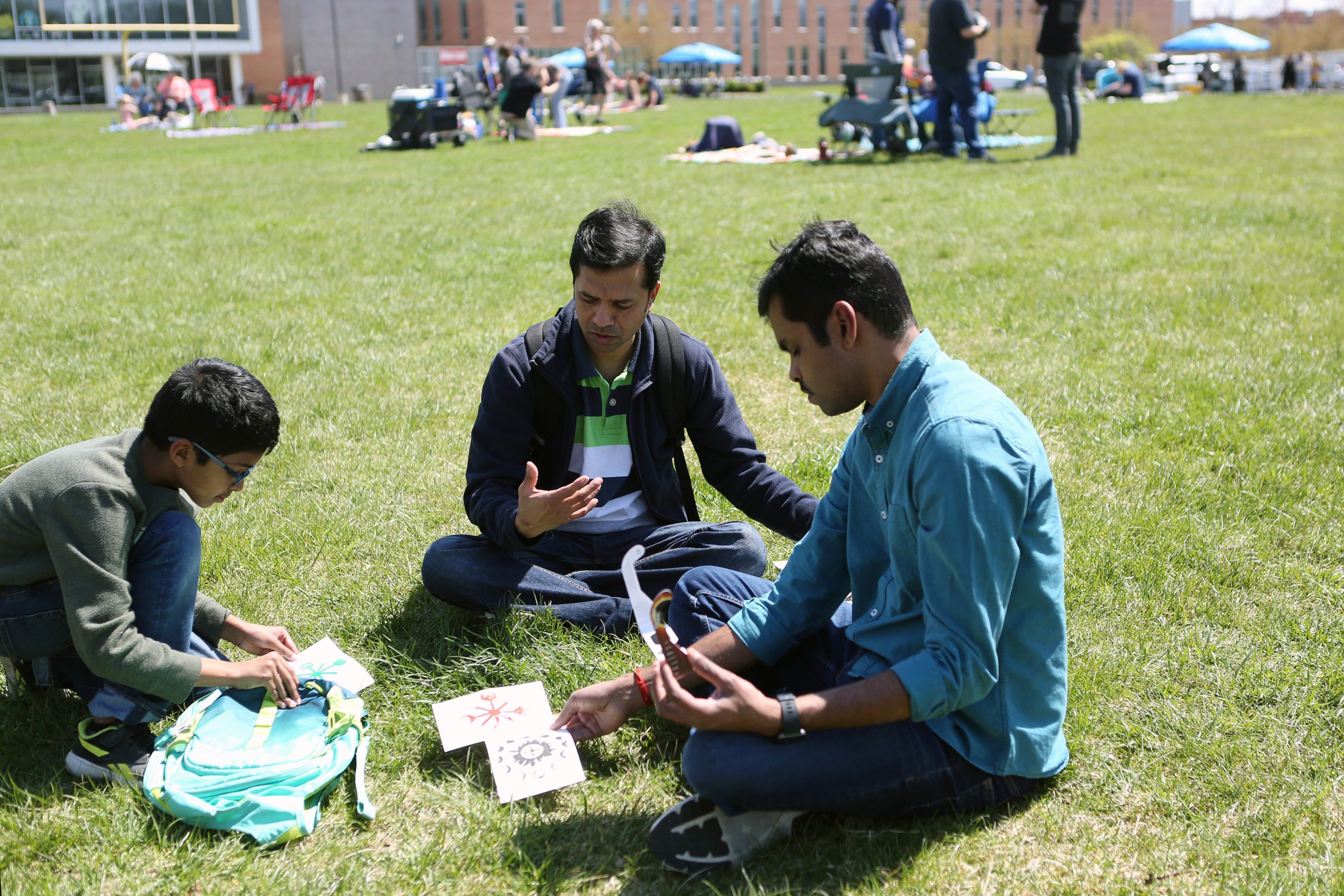 Advait Shende, Anand Ashende and Subbiah Subramanian sort through art created during the Solar Spectactular Eclipse Viewing Party hosted by kidscommons and the Bartholomew County Public Library at Central Middle School, Columbus, Ind., Monday April 8, 2024.