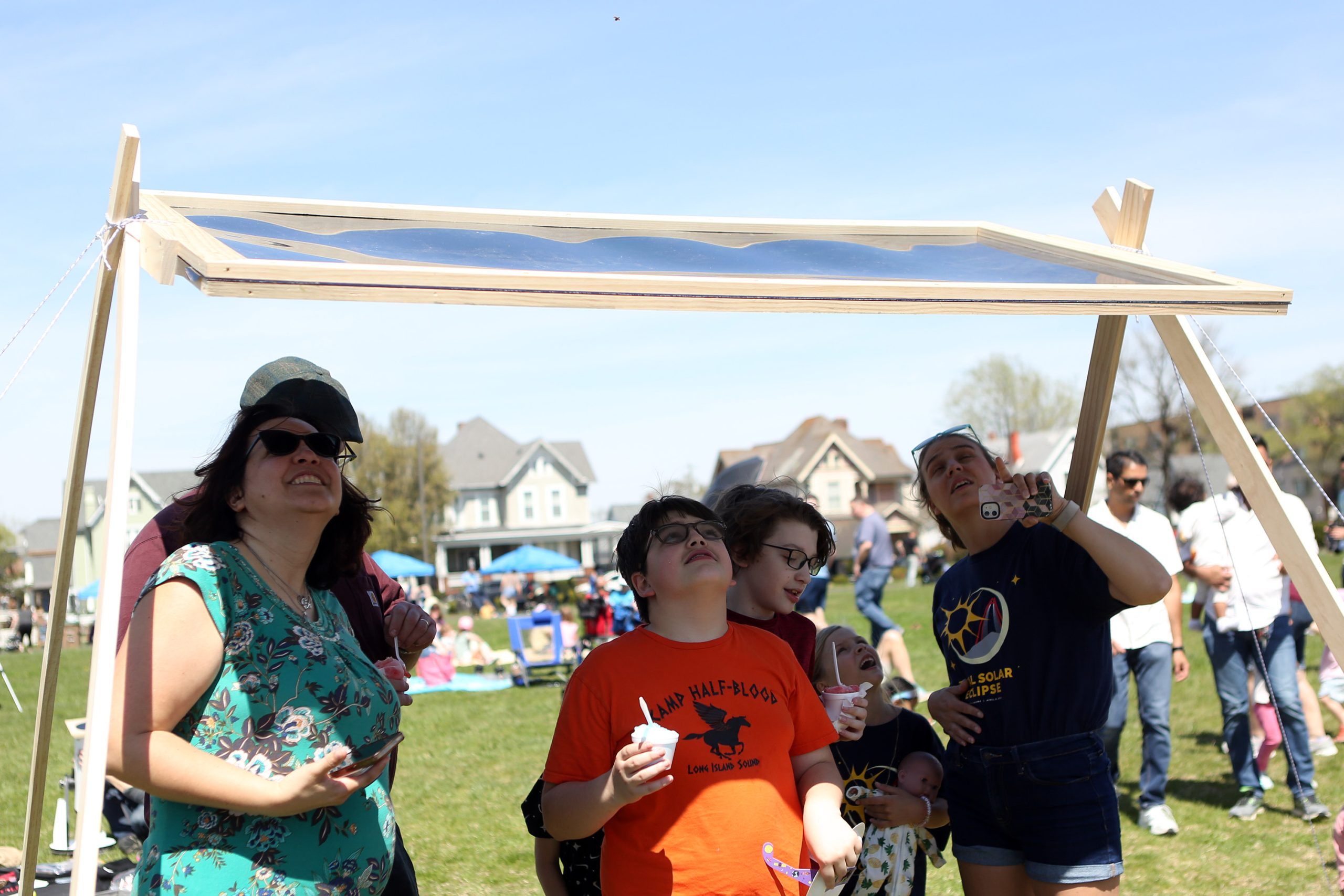 People gather under the filter set up to view the eclipse during the Solar Spectactular Eclipse Viewing Party hosted by kidscommons and the Bartholomew County Public Library at Central Middle School, Columbus, Ind., Monday April 8, 2024.