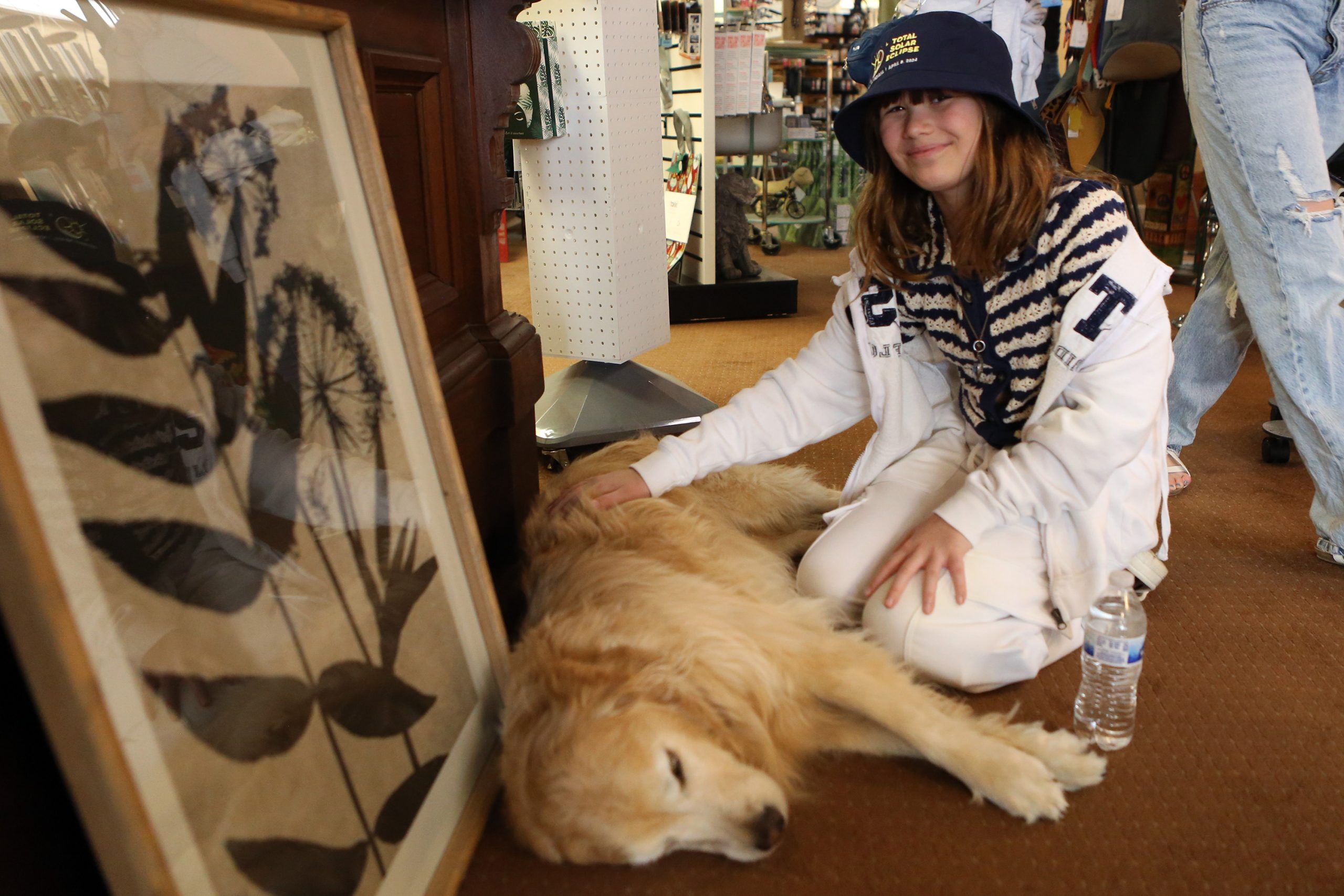 Gabriela Ferreira pets Clemmie at Baker's Fine Gifts before the start of the eclipse in Columbus, Ind., Monday, April 8, 2024.