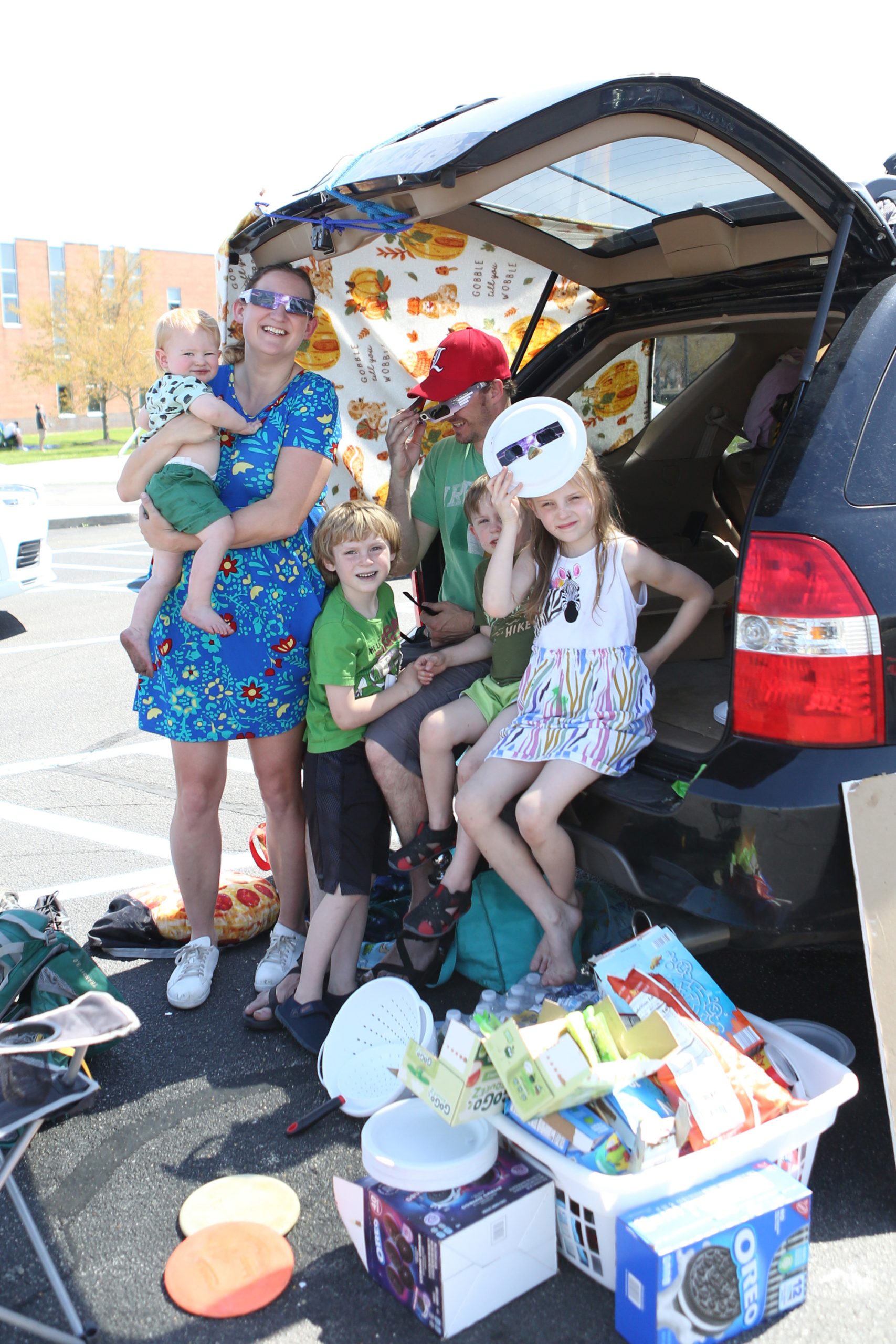 Lydia Sargent, holding Levi Sargent, Quinn Sargent, Scott Sargent, Cal Sargent and Selah Sargent have a tailgate party during the Solar Spectactular Eclipse Viewing Party hosted by kidscommons and the Bartholomew County Public Library at Central Middle School, Columbus, Ind., Monday April 8, 2024.
