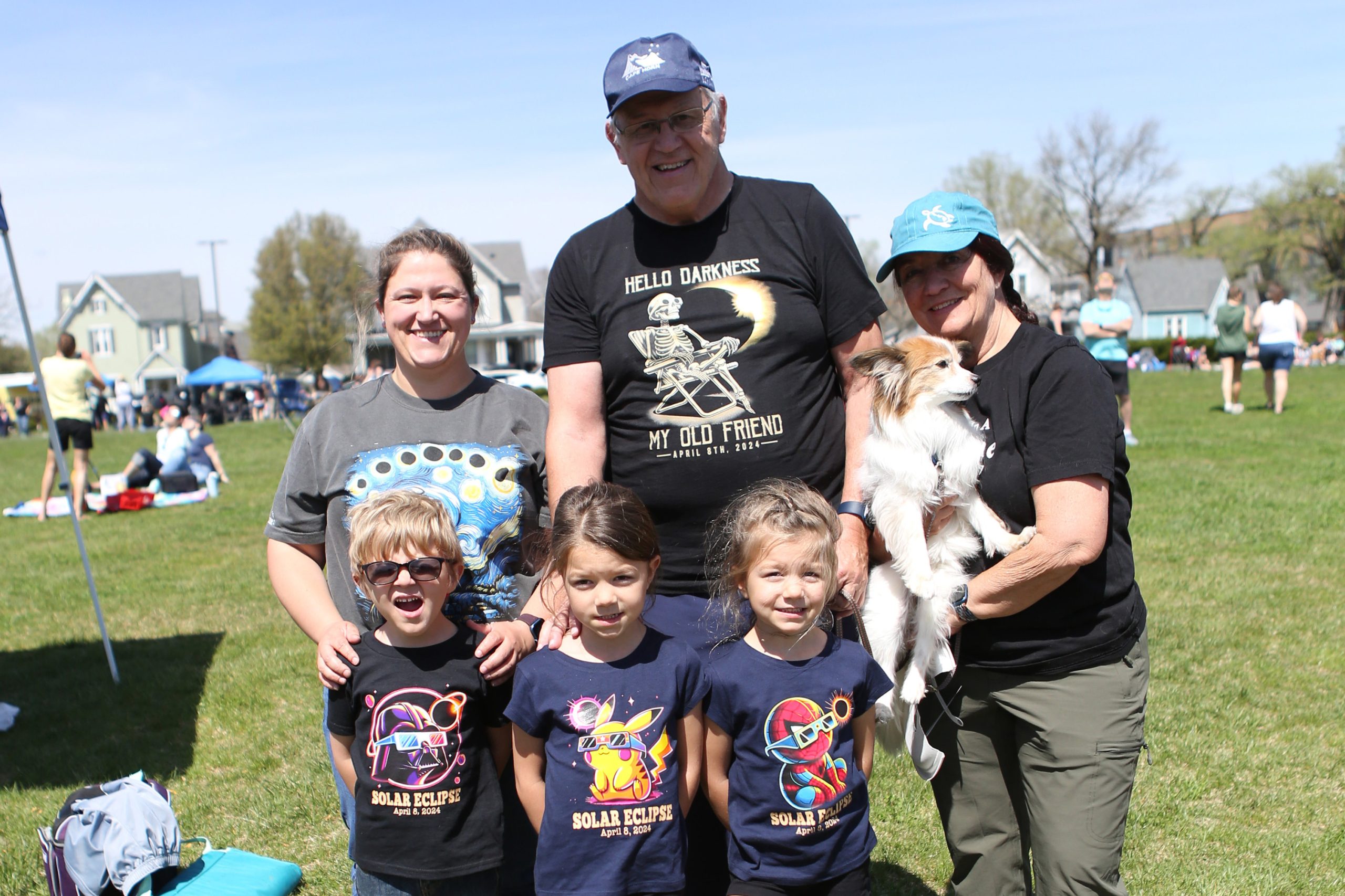 Alyssa Latham, from Albuquerque NM, back left, Chip Latham, and Julie Latham holding Gizmo, from Hebron, KY,and Karsten Chandle, front left, Amelia Chander and Piper Chandler, from Orient, OH., wearing custom made t-shirts by Julie Latham, during the Solar Spectactular Eclipse Viewing Party hosted by kidscommons and the Bartholomew County Public Library at Central Middle School, Columbus, Ind., Monday April 8, 2024.