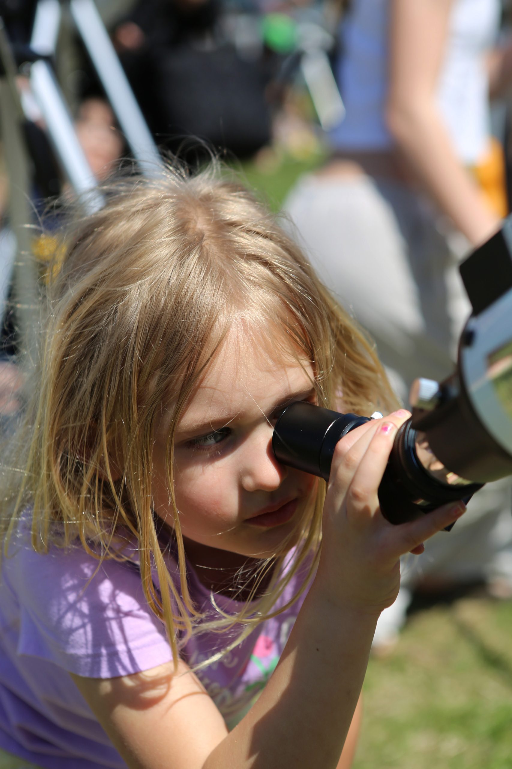 Genevieve Duvall, of Charleston Ind., looks through a telescope during the Solar Spectactular Eclipse Viewing Party hosted by kidscommons and the Bartholomew County Public Library at Central Middle School, Columbus, Ind., Monday April 8, 2024.