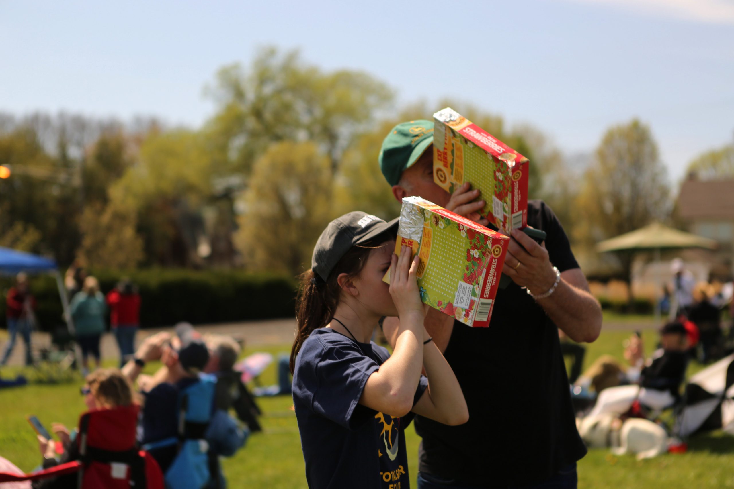 Sarah Putman and Harold Putman from Charlestown, Ind., view the eclipse using cereal boxes they crafted during the Solar Spectactular Eclipse Viewing Party hosted by kidscommons and the Bartholomew County Public Library at Central Middle School, Columbus, Ind., Monday April 8, 2024.