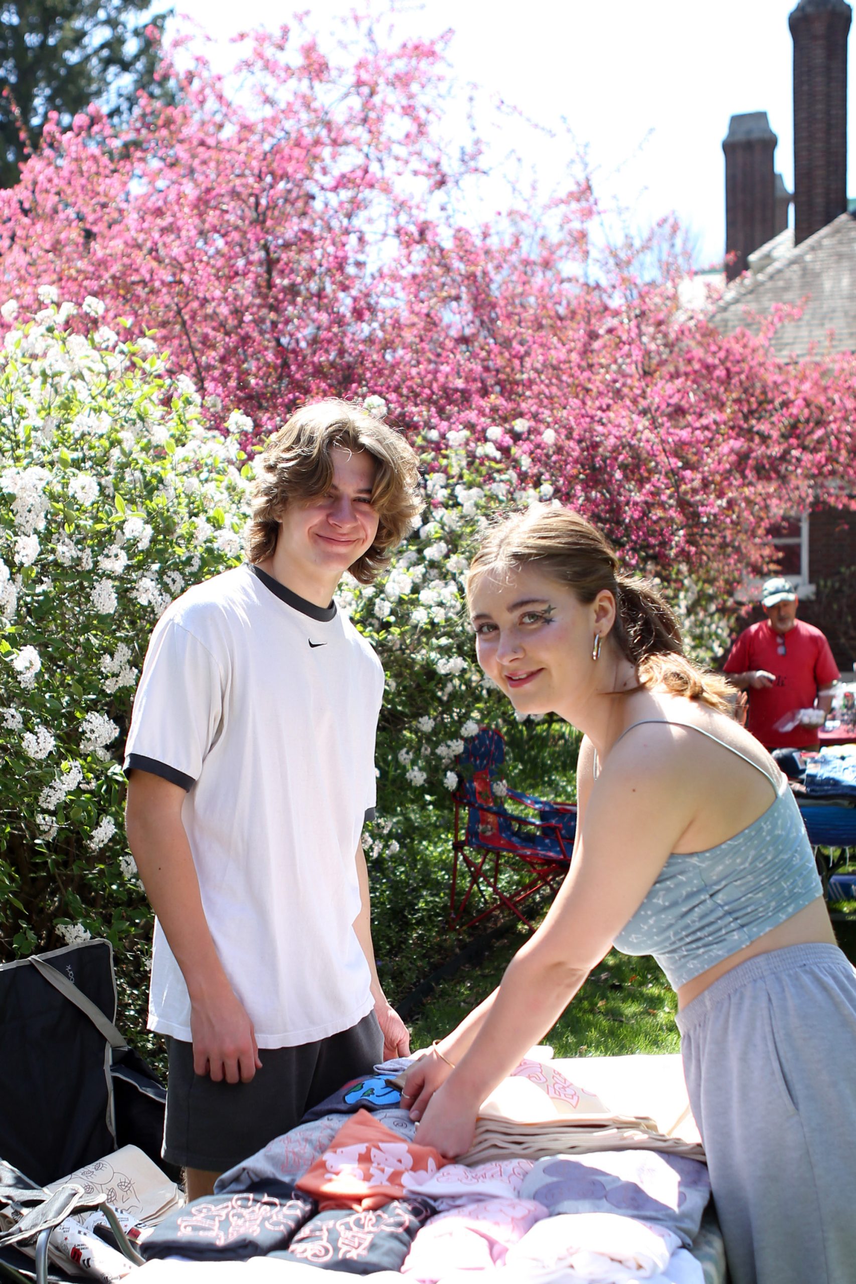Maximus Banaschak and Novah Ulm sell solar eclipse shirts and bags at the No Mad Arts solar eclips event at Irwin Gardens, Columbus, Ind., Monday, April 8, 2024.