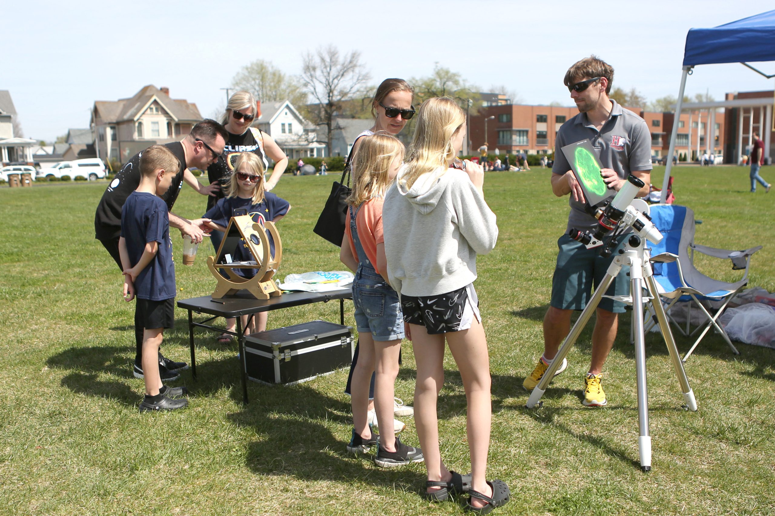 Cameron Wallace, Moses, and Debra Wallace, from Charlotte NC, during the Solar Spectactular Eclipse Viewing Party hosted by kidscommons and the Bartholomew County Public Library at Central Middle School, Columbus, Ind., Monday April 8, 2024.