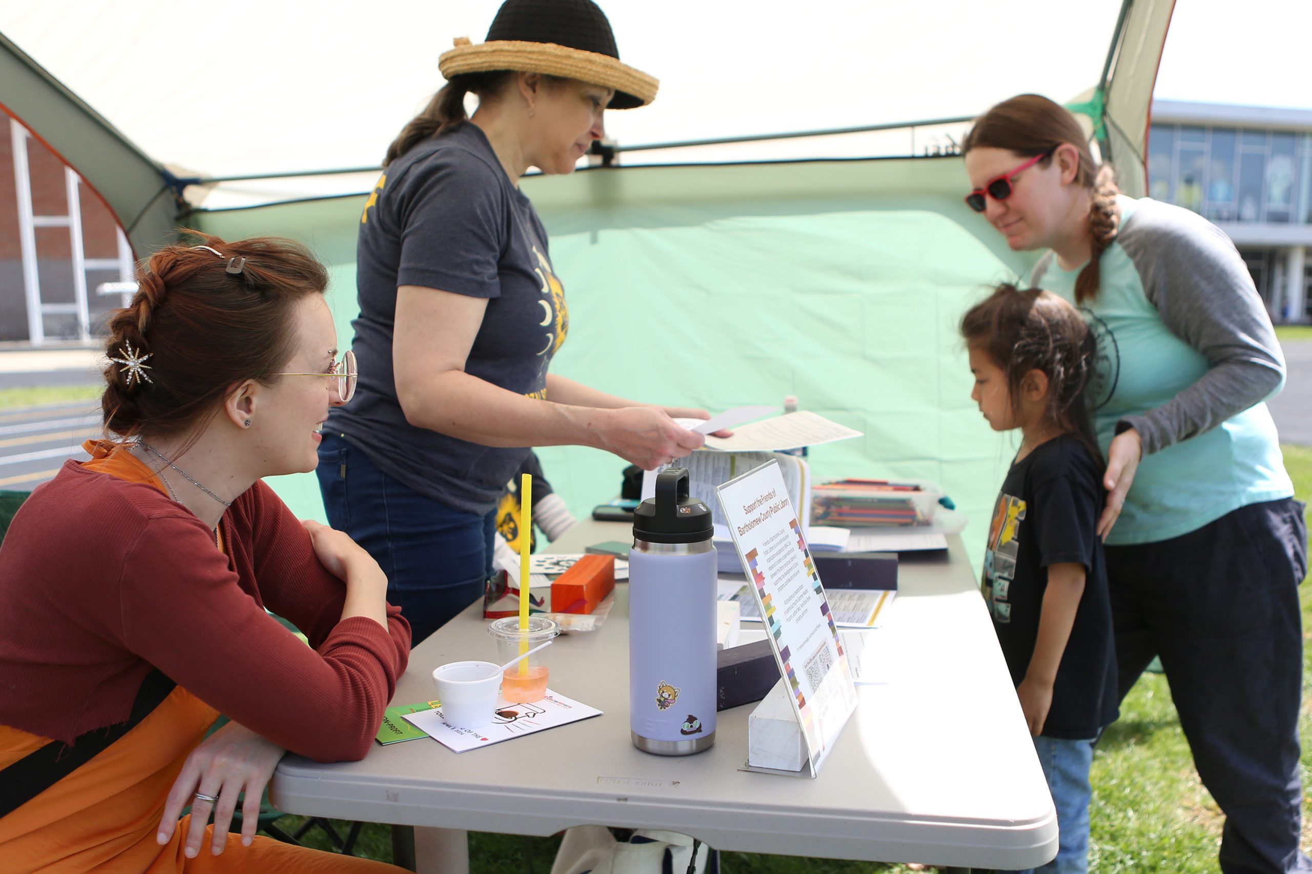 Bethany Hohman, clockwise from left, and Kimberly Bush Hoffman, give eclipse glasses and information about their programs to Tolliver Pasteka and Ashley Pasteka at the Friends of the Library booth during the Solar Spectactular Eclipse Viewing Party hosted by kidscommons and the Bartholomew County Public Library at Central Middle School, Columbus, Ind., Monday April 8, 2024.