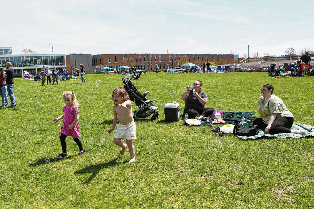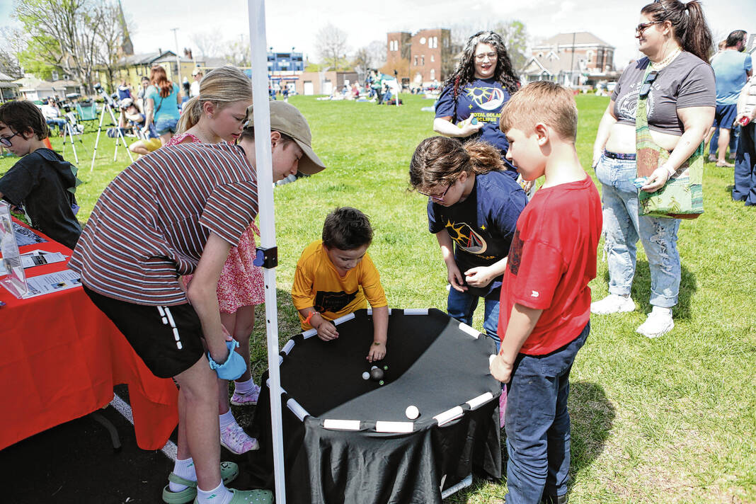 Carla Clark | For The Republic Ella Castelloe and May Sigman, from Ashville, NC, during the Solar Spectactular Eclipse Viewing Party hosted by kidscommons and the Bartholomew County Public Library at Central Middle School, Columbus, Ind., Monday April 8, 2024.