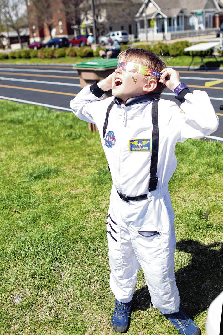 Students could hear what it took to build a moon base with kidscommons and were able to learn about block printing by creating an eclipse-like design with library instructors. Some came dressed for the occasion — young Asher Anderson came decked out in a space suit. Many lined up to peek through telescopes to get an idea of what an eclipse is all about.