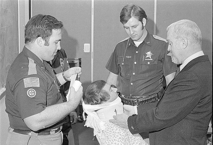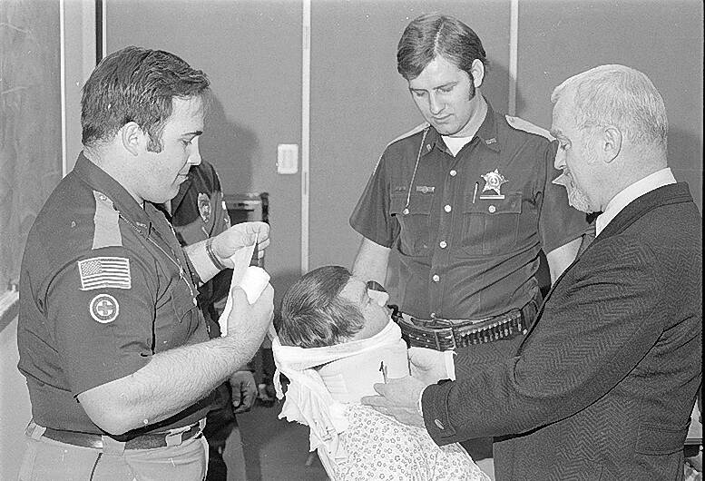 Students in Ivy Tech’s emergency medical technician ambulance course apply a spinal board to “victim” Don Clark, center, on April 13, 1974. Doing the work are Bartholomew County Sheriff’s Deputies Rick Gibson, left, and James Baker, center. Dr. Herman Echsner, physician coordinator for the course, assists at right.