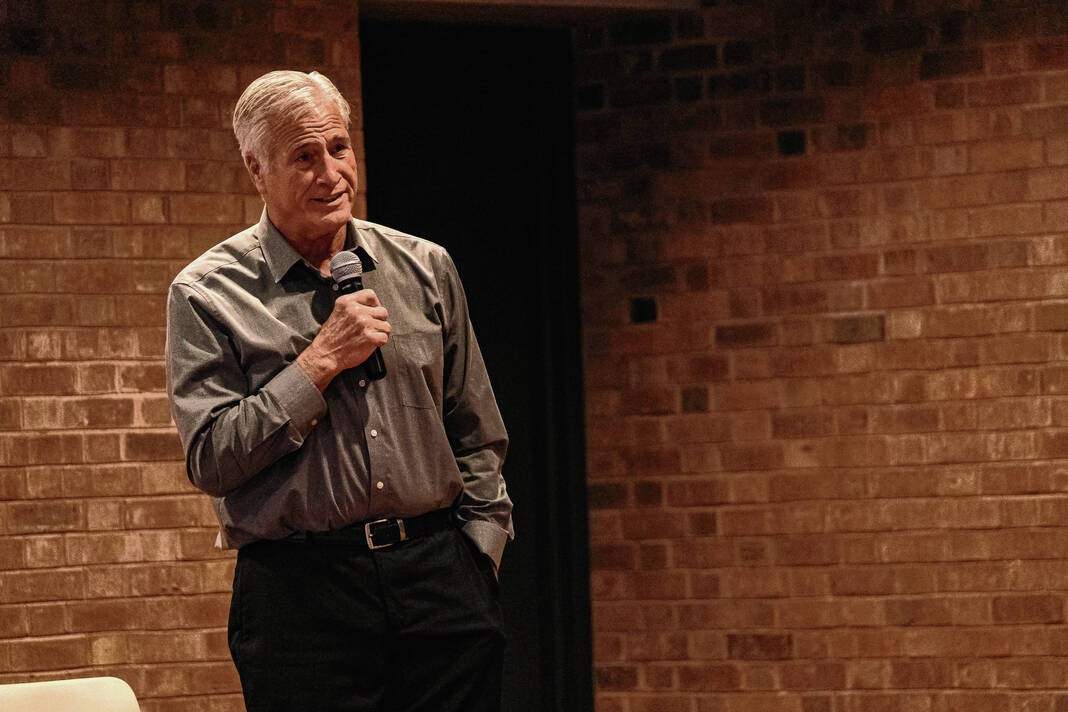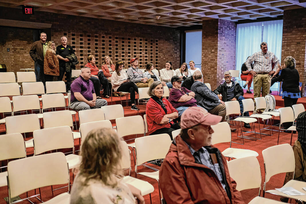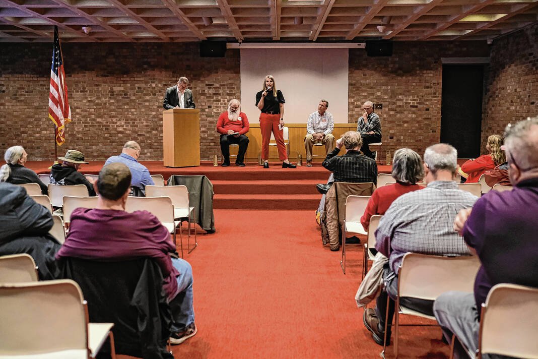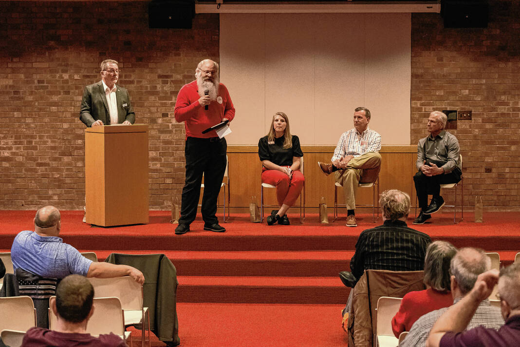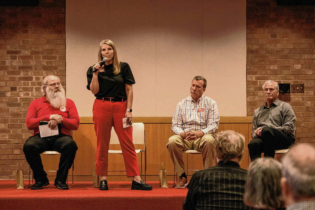 Mike Wolanin | The Republic John Foster, from left, moderates a candidate forum with Republican Bartholomew County Council At-Large candidates Marcus Speer, Kim Bennett and John Prohaska and Republican Bartholomew County Commissioner candidate Larry Kleinhenz in the Red Room at the Bartholomew County Public Library in Columbus, Ind., Thursday, April 11, 2024. The forum was organized by the Bartholomew County Republican Ladies League.