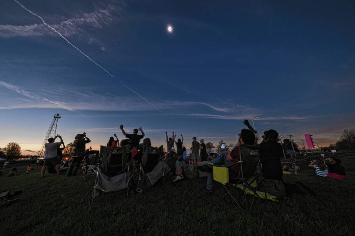 Mike Wolanin | The Republic Spectators cheer as the solar eclipse reaches its totality during the Eclipsing the Renaissance eclipse viewing event at the Columbus Airport Airpark on Monday.