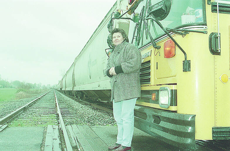 Claudia McCracken of Columbus stands in front of her snub nose bus at the Spear Street railroad crossing on April 17, 1999, where a line of train cars is parked.