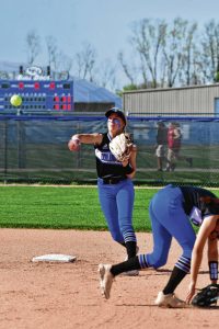 Columbus North’s Kelsey Lovelace throws the ball to first base to complete a double play during Monday’s game against Columbus East at Southside Elementary.