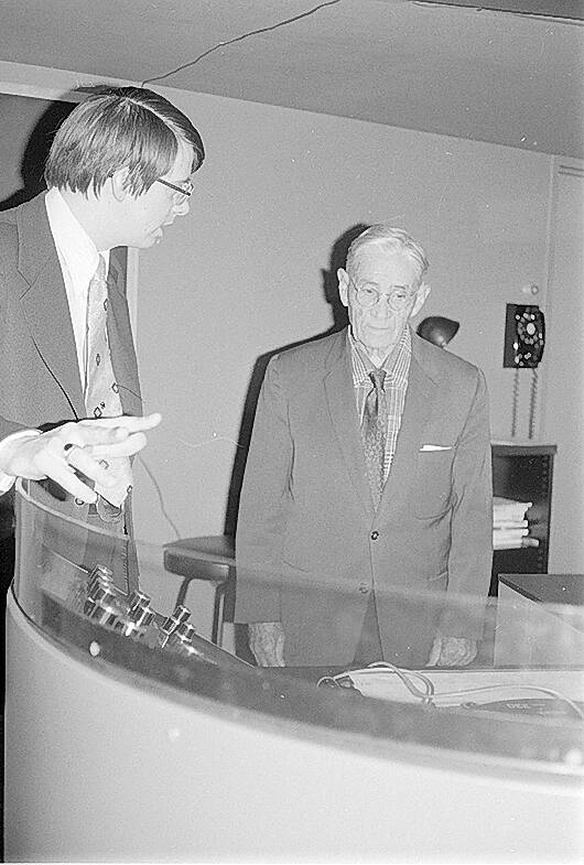 Donald Knapp, director of the Columbus East High School planetarium, at left, explains to Loren S. Noblitt the operating console for the planetarium on April 20, 1974.