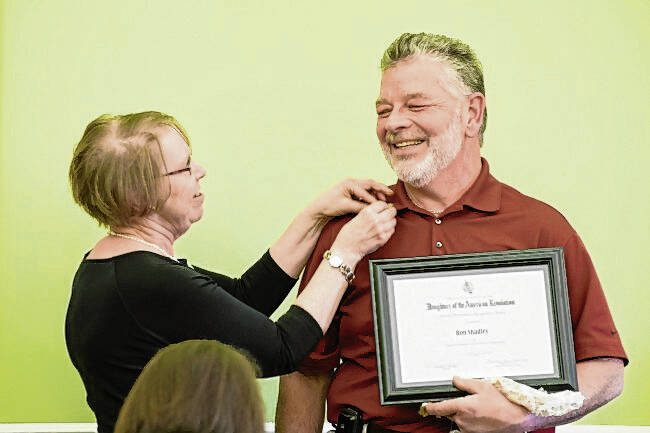 Jane Johnson places a pin on Ron Shadley after she presented him with the National Society of the Daughters of the American Revolution’s Historic Preservation Recognition Award on April 19, 2014.