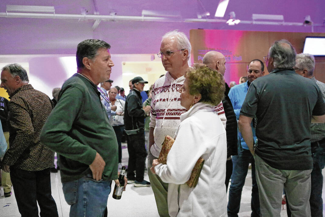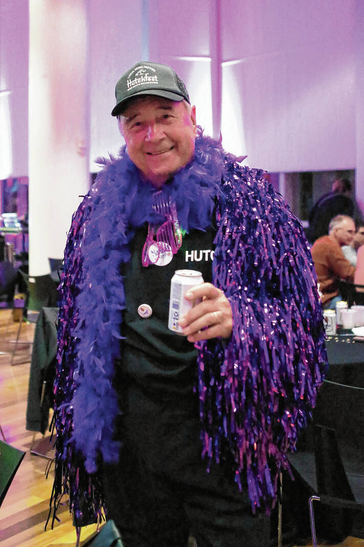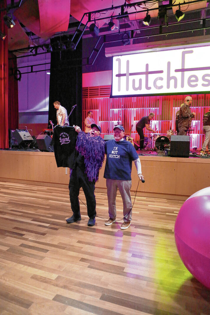 Carla Clark | For The Republic Hutch Schumaker reacts as he holds up the shirt given to him by Buck Ritz during HutchFest 2024 at the Commons, Columbus, Ind., Friday, April 19, 2024.