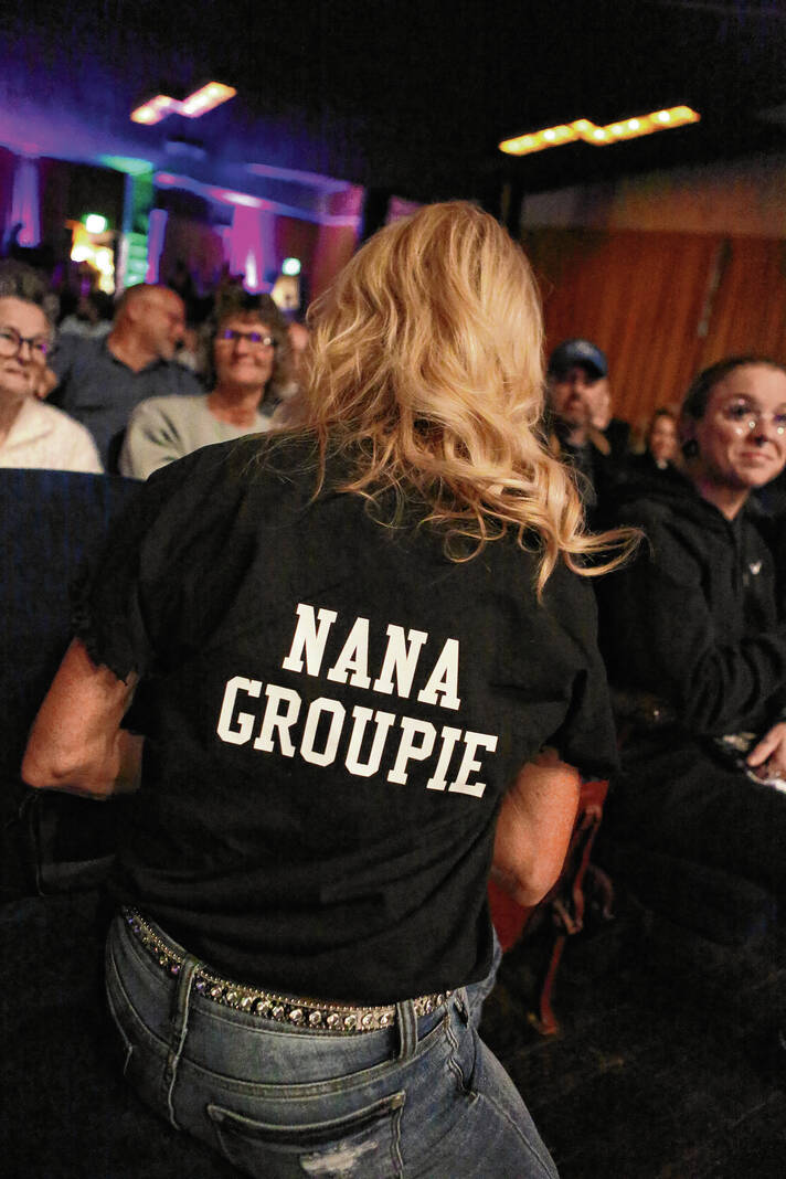 Carla Clark | For The Republic Katrina Barr, grandmother of bass player Henry Barr, wears her groupie shirt during HutchFest 2024 at the Crump Theatre, Columbus, Ind., Saturday, April 19, 2024.