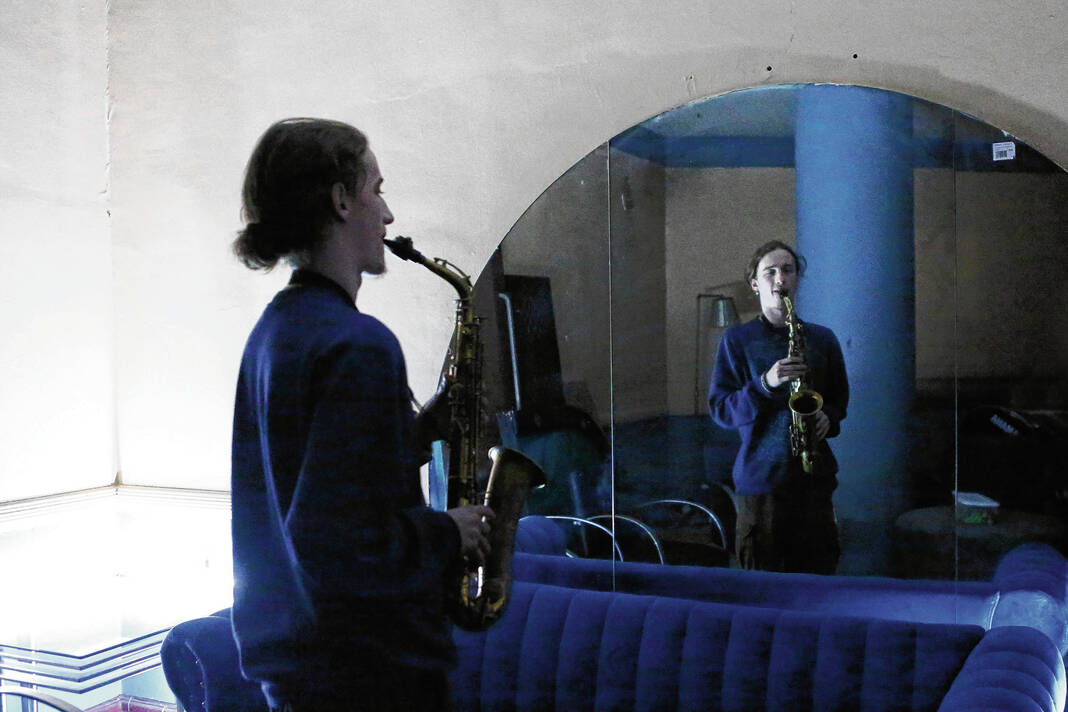 Carla Clark | For The Republic Elvin Deckard, of the Mycota band, warms up in the men’s lounge during HutchFest 2024 at the Crump Theatre, Columbus, Ind., Saturday, April 19, 2024.