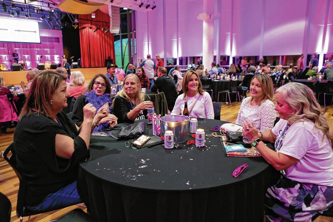 Carla Clark | For The Republic Cindy Owens, Carol Behling, Laura Montgomery, Jeannine Barker, Scarlett Barker and Jana Thompson visit and listen to the music during HutchFest 2024 at the Commons, Columbus, Ind., Friday, April 19, 2024.