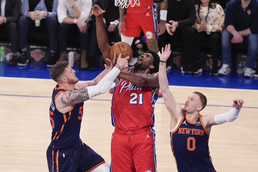 The Knicks got the go-ahead 3-pointer from Donte DiVincenzo with 13 seconds left, a possession that started when they stole the ball from Tyrese Maxey. Maxey was unable to cleanly catch the inbounds pass while swarmed by Jalen Brunson and Josh Hart and fell to the ground, with Hart then ripping the ball away from him.