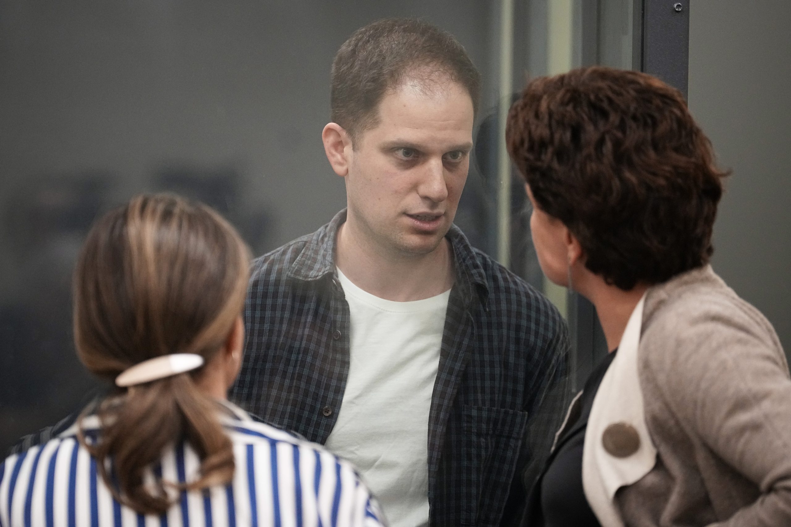 Wall Street Journal reporter Evan Gershkovich speaks with his lawyers standing in a glass cage in a courtroom at the First Appeals Court of General Jurisdiction in Moscow, Russia, Tuesday, April 23, 2024. A court will considers an appeal against the arrest of WSJ reporter Evan Gershkovich who was detained on espionage charges in Yekaterinburg last year. (AP Photo/Alexander Zemlianichenko)