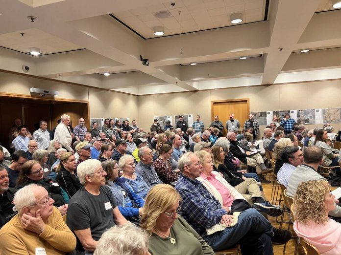 A crowd gathers to comment about a proposed solar farm facility during a zoning hearing in Bartholomew County in February.