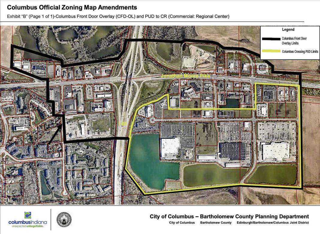 The Columbus Plan Commission on May 8 will consider three amendments: one to create a new “Columbus Front Door Overlay Zoning District,” another to include properties near the I-65 and Jonathan Moore Pike intersection in the new district and a third to rezone Columbus Crossing from PUD (Planned Unit Development) to CR (Commercial: Regional Center).