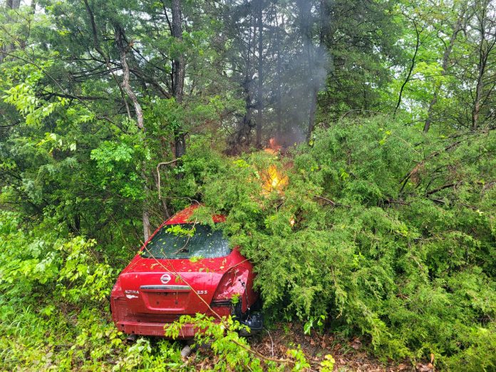 As deputies responded, a call came in reporting a motor vehicle crash in Geneva Township, according to investigators. The caller informed emergency services that the individual involved had exited the vehicle and escaped on foot through the nearby woods. The vehicle then became engulfed in flames.
