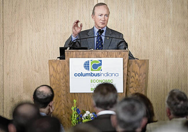 Purdue University President Mitch Daniels delivers they keynote presentation on May 5, 2014, at the Columbus Economic Development Board annual meeting at The Commons.
