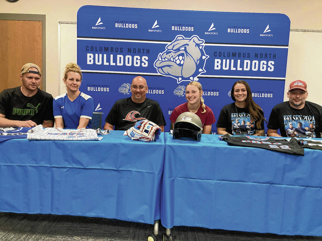 Columbus North senior Kelsey Lovelace, third from right, signed a letter-of-intent Monday night to play softball at Calumet College of St. Joseph. She is joined by, from left, Kris Lobdell, mother Anne Dunham-Lovelace, Calumet coach Dave Lopez, step-mother Savannah Lovelace and father Kevin Lovelace.