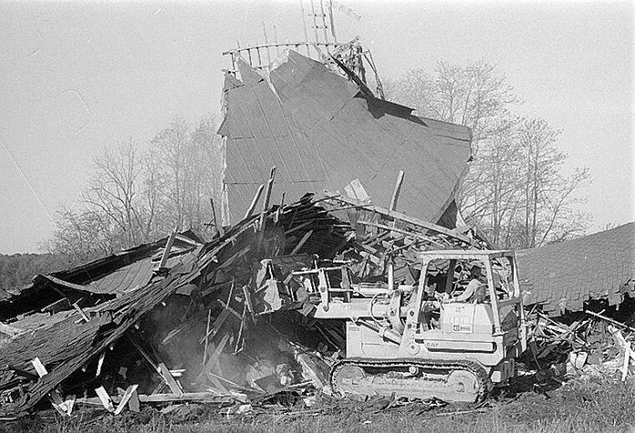 The Round Barn, located on State Road 9 one mile south of State Road 46, came down with a rumble on May 7, 1974, when Dennis Smith, bulldozer operator for Contractors United, Inc., of Columbus, thrust the machine into the building’s concrete base. The barn was the center of a failed fund drive in an attempt to move the structure.