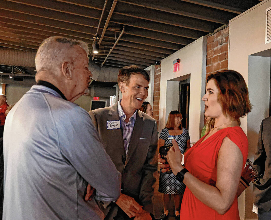 Republican 6th District candidate Jefferson Shreve, center, talks with Democratic Johnson County Council At-Large candidate Blythe Potter, right, and another attendee at Celebrate Aspire on Thursday in Franklin. (ROB BAKER | DAILY JOURNAL)