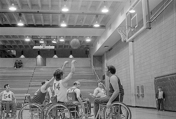 Members of the Indianapolis Olympians wheelchair basketball team reach for the ball during an exhibition game at Southside Junior High School on May 8, 1974, sponsored by the Columbus Sertoma Club. Proceeds went to the Speech and Hearing Clinic and the Columbus Youth Camp.
