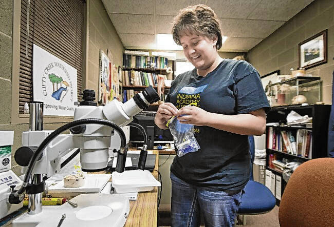 Research assistant Ashlee Butler prepares an insect sample to process with a microscope on May 8, 2014, at Ivy Tech Community College. Butler graduated from Ivy Tech and continued her studies at Purdue University.