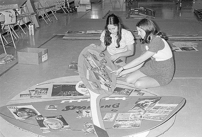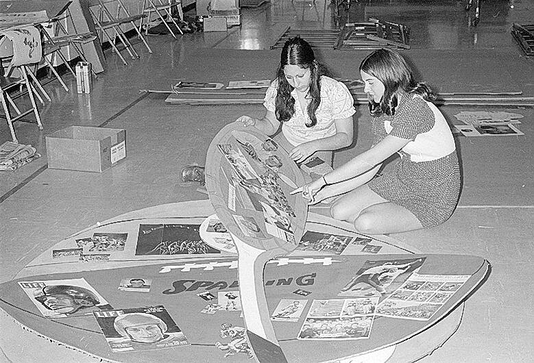 Columbus East High School senior Pam Welch, right, shows East senior exchange student Pili Obando, from Colombia, special decorations for the after-prom party at the Foundation for Youth on May 16, 1974.