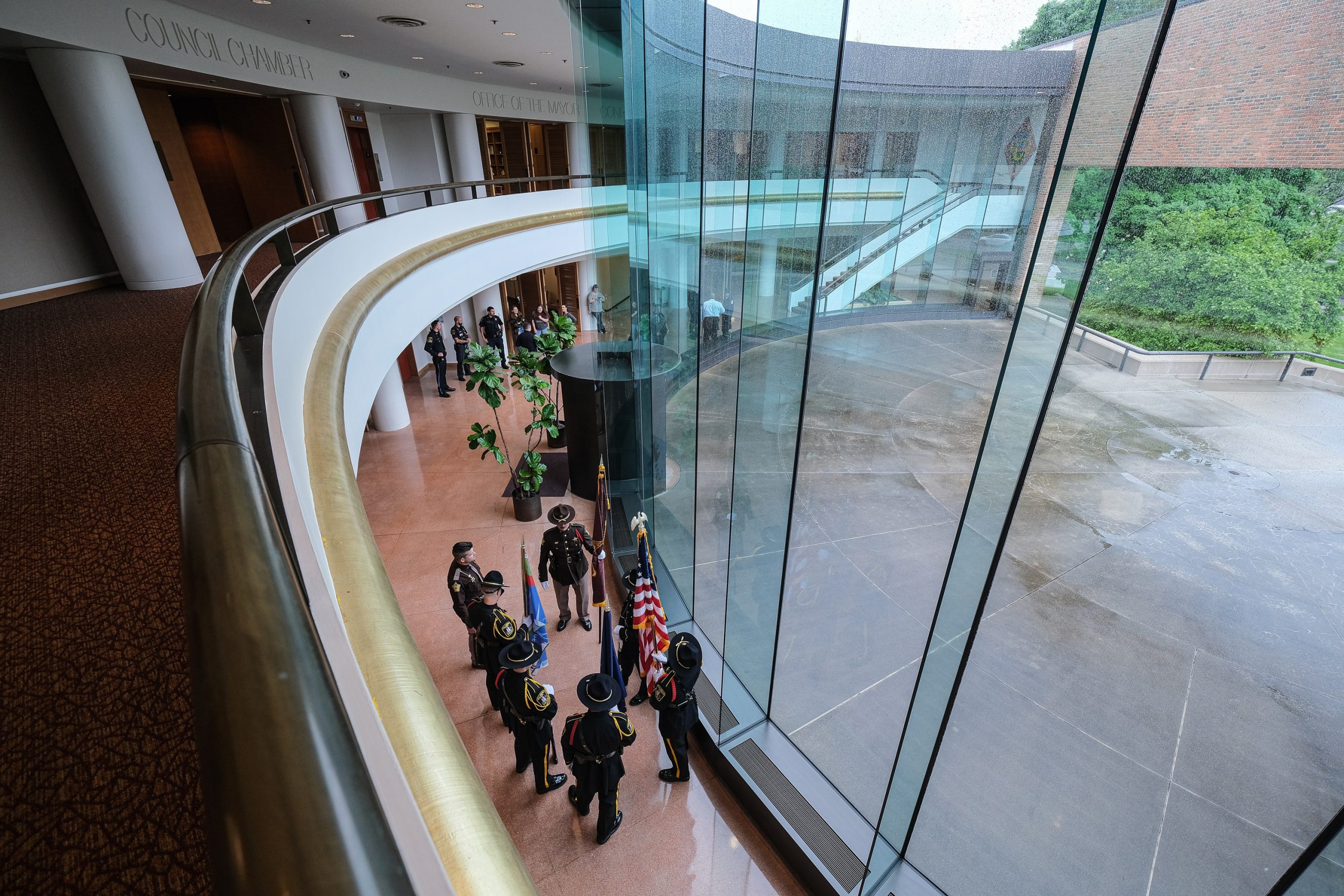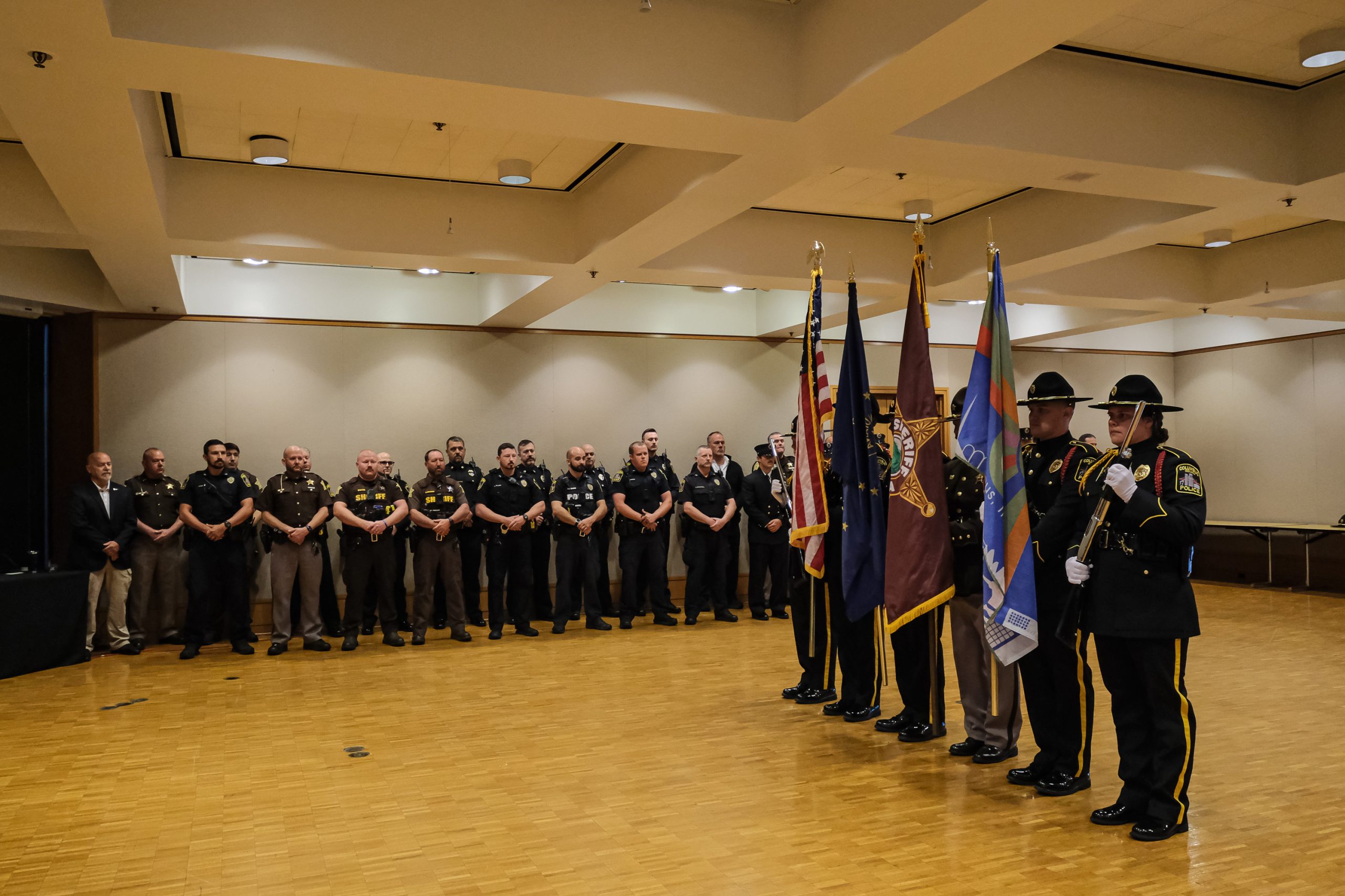 Members of the color guard from the Columbus Police Department and Bartholomew County Sheriff’s Office present the colors for the annual Public Safety Memorial Service at Columbus City Hall in Columbus, Ind., Friday, May 17, 2024.