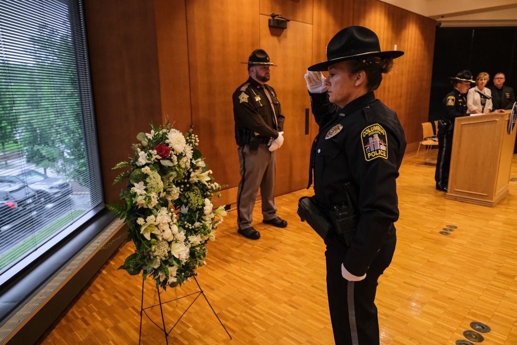 Columbus police officer Angie Owens salutes after placing a red rose on a wreath in honor of a fallen law enforcement officer from Indiana during the annual Public Safety Memorial Service at Columbus City Hall in Columbus, Ind., Friday, May 17, 2024.