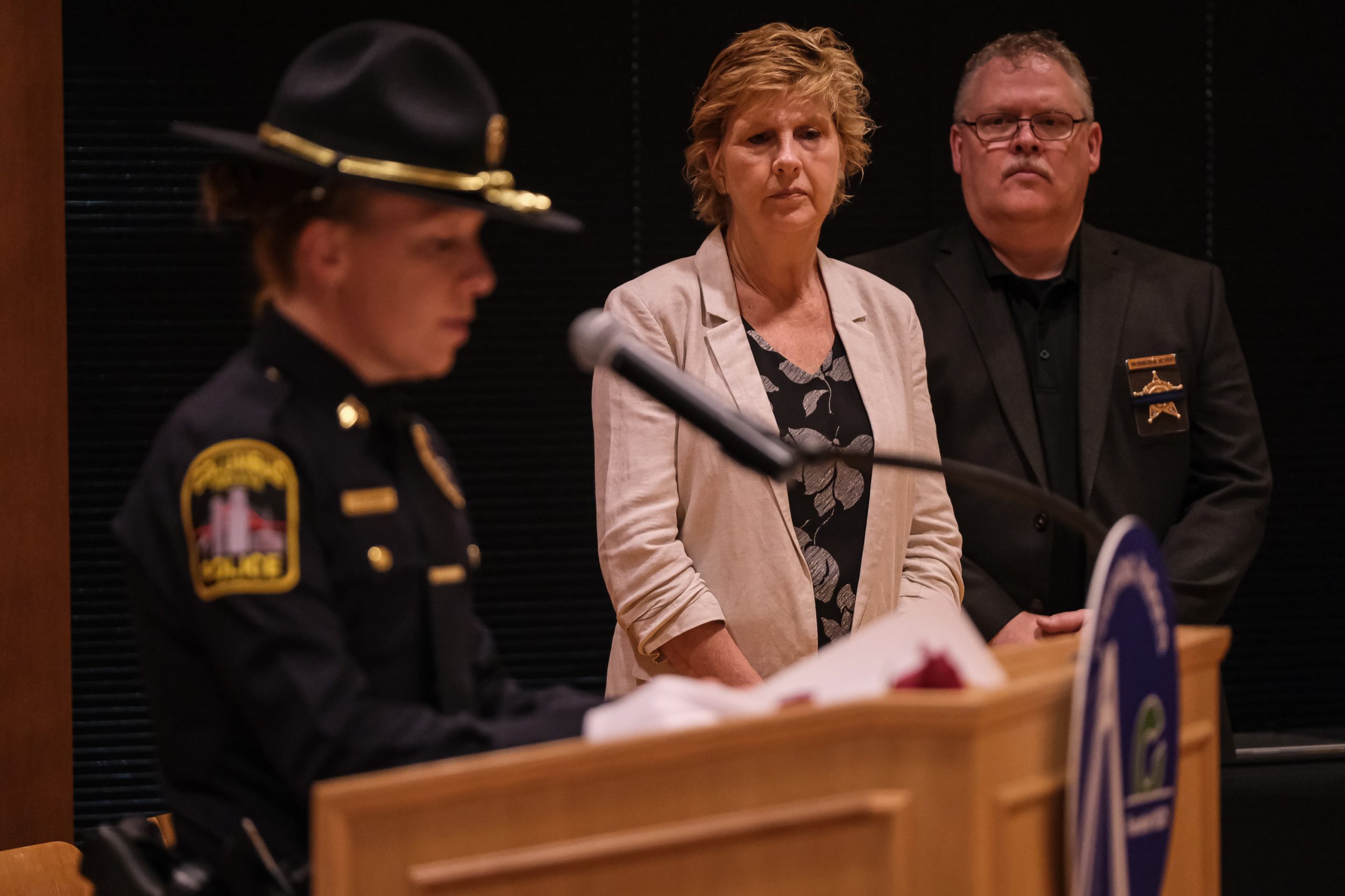 Columbus Mayor Mary Ferdon and Bartholomew County Sheriff’s Office Chaplain Robert Vester listen as Columbus police Sgt. Julie Quesenbery reads the names of fallen law enforcement officers from across the country during the annual Public Safety Memorial Service at Columbus City Hall in Columbus, Ind., Friday, May 17, 2024.