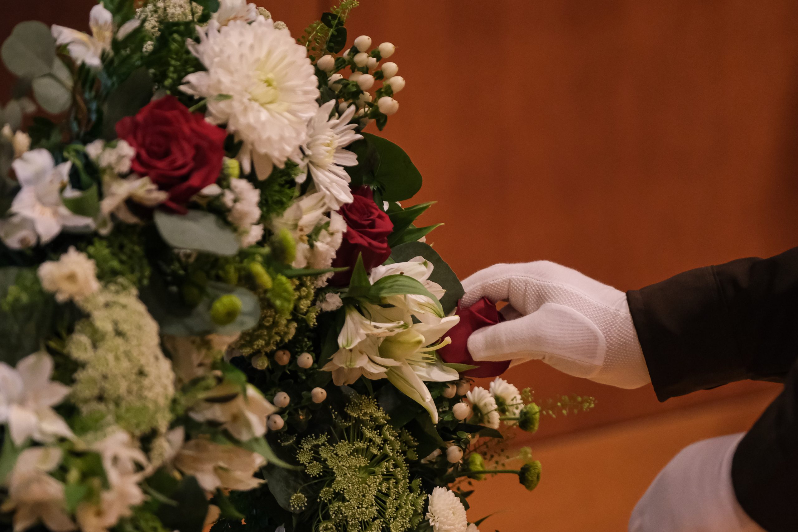 Bartholomew County Sheriff’s Sgt. Andrew Whipker places a red rose on a wreath in honor of a fallen law enforcement officer from Indiana during the annual Public Safety Memorial Service at Columbus City Hall in Columbus, Ind., Friday, May 17, 2024.