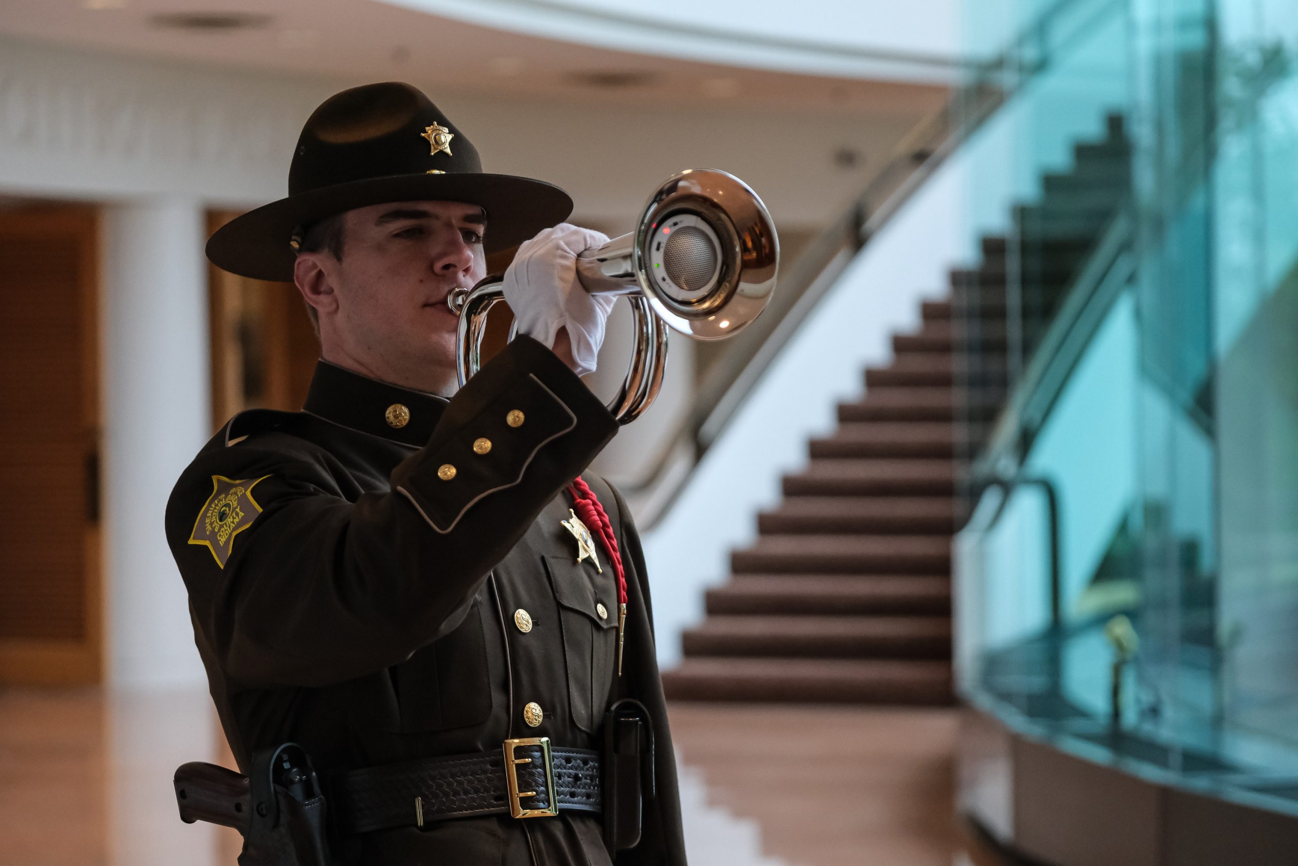 Bartholomew County Sheriff’s deputy Ryland Fluhr holds a bugle to his mouth as it plays a recording of Taps during the annual Public Safety Memorial Service at Columbus City Hall in Columbus, Ind., Friday, May 17, 2024.