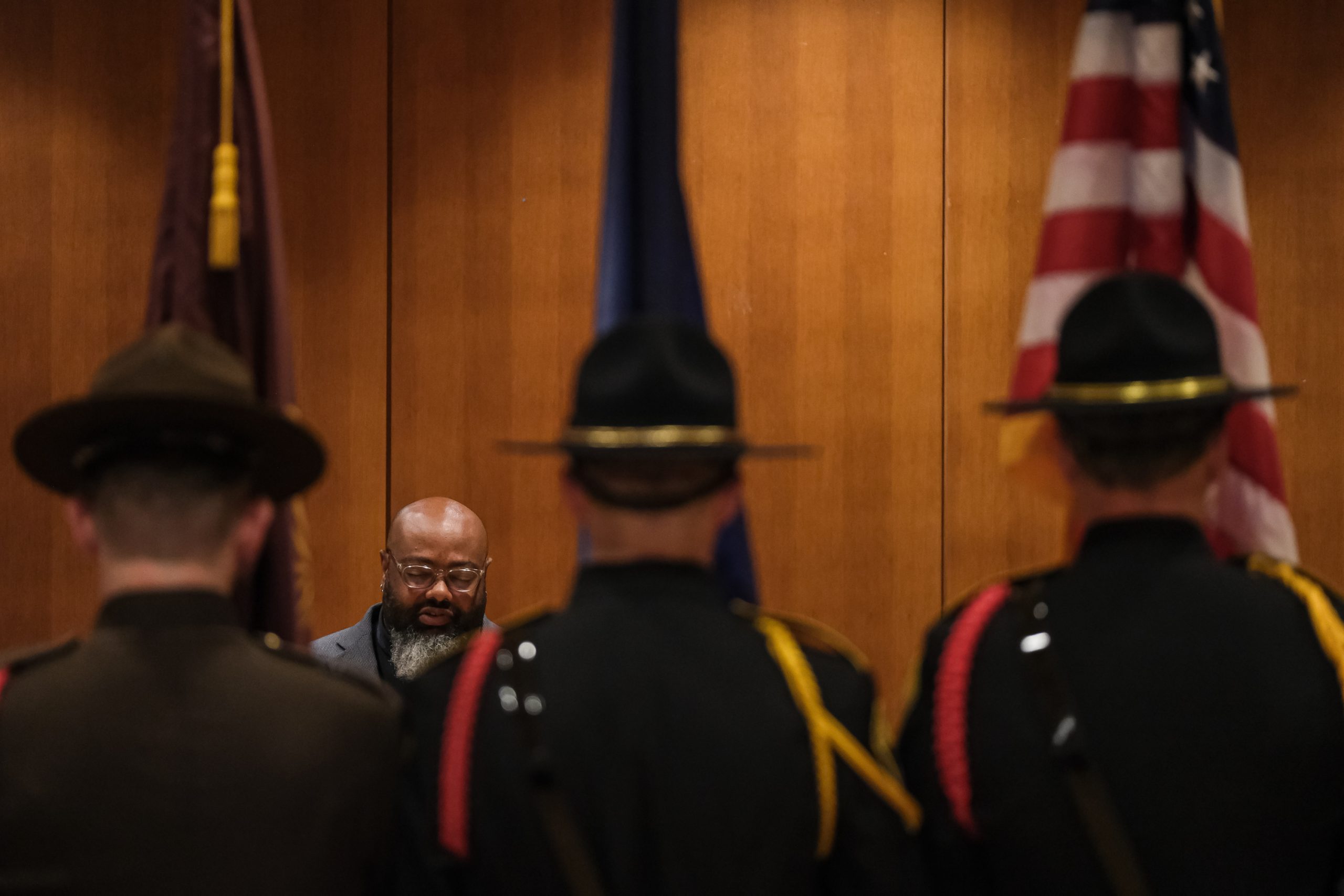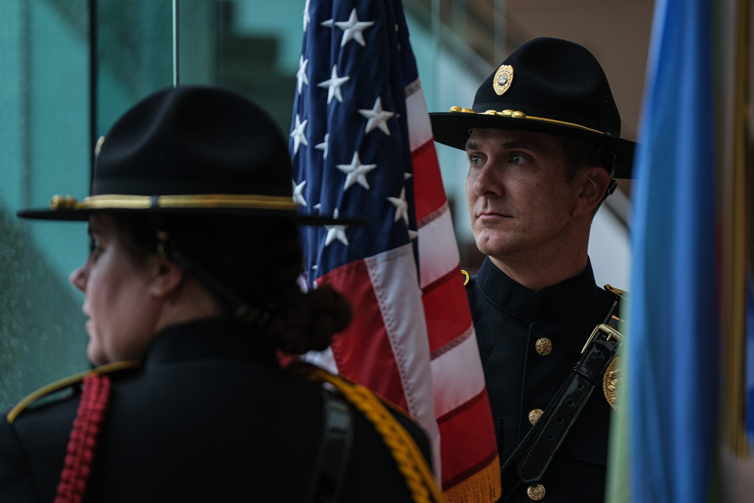 Columbus officer and color guard member Mike Pigman holds the American flag before he and the other color guard members present the colors for the annual Public Safety Memorial Service at Columbus City Hall in Columbus, Ind., Friday, May 17, 2024.