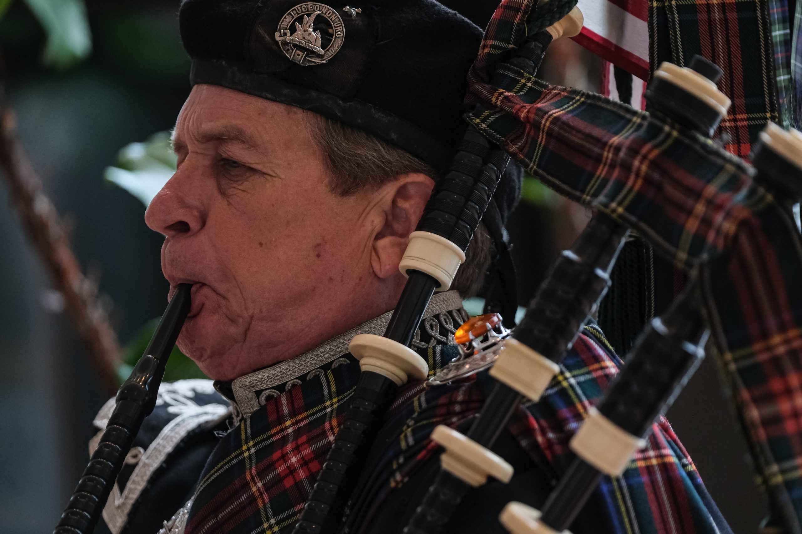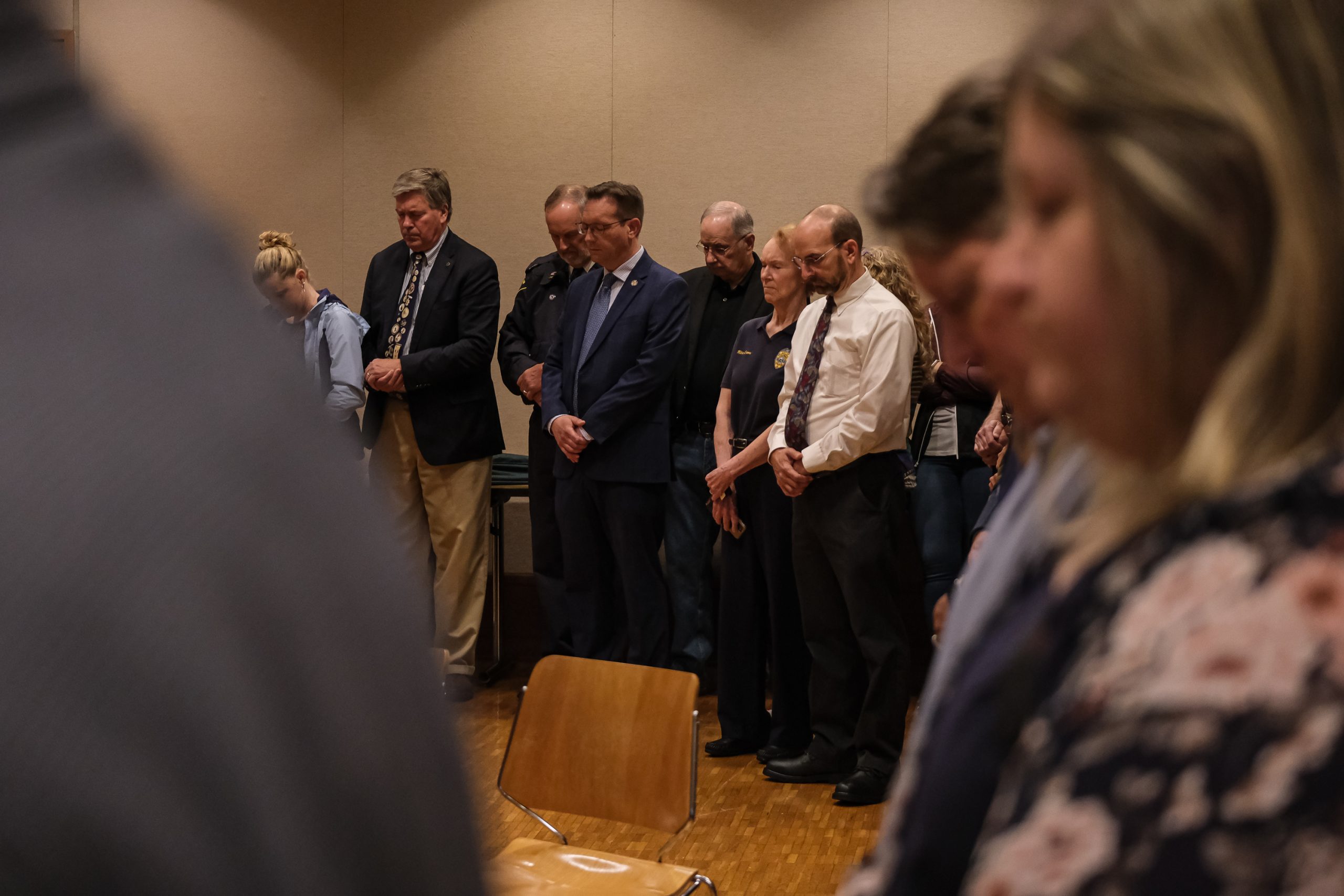 Guests bow their heads as Bartholomew County Sheriff’s Office Chaplain Robert Vester delivers the opening prayer for the annual Public Safety Memorial Service at Columbus City Hall in Columbus, Ind., Friday, May 17, 2024.