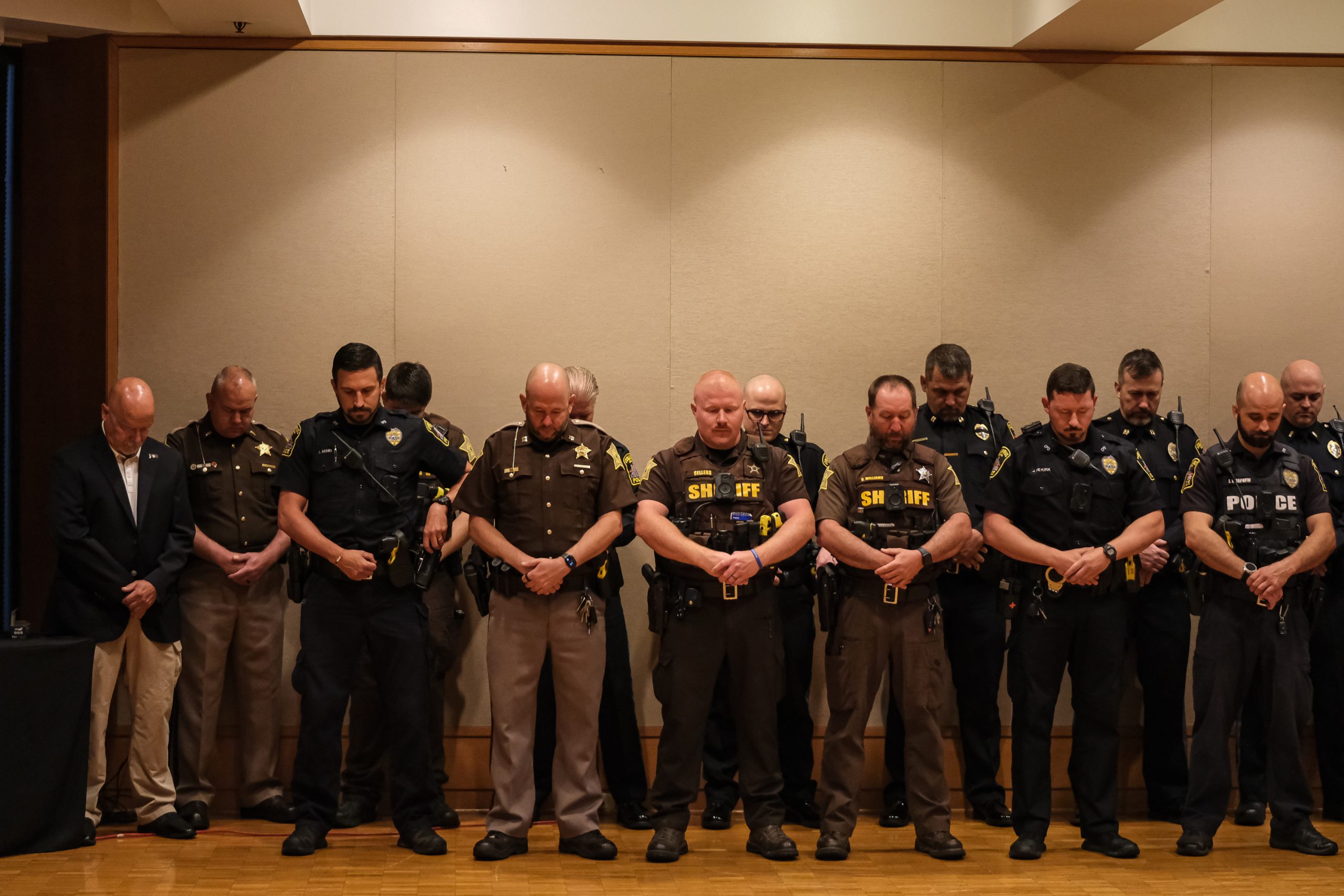 Members of the Bartholomew County Sheriff’s Office and Columbus Police Department bow their heads as Bartholomew County Sheriff’s Office Chaplain Robert Vester delivers the opening prayer for the annual Public Safety Memorial Service at Columbus City Hall in Columbus, Ind., Friday, May 17, 2024.